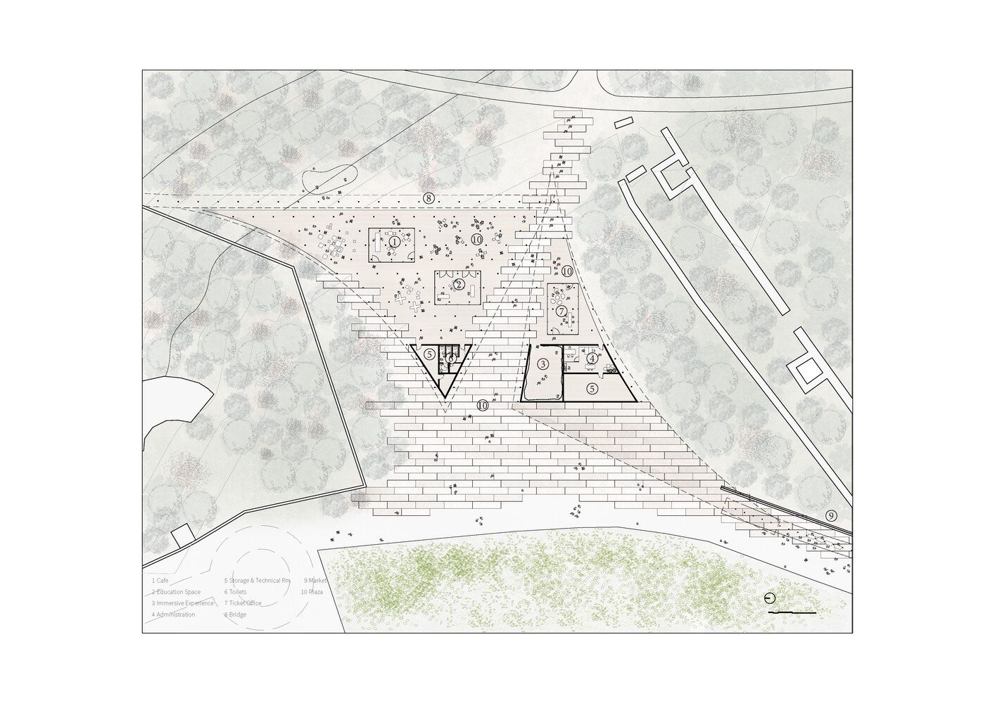 Strategija organizacije pejzaža posmatra čitavu lokaciju kao arheološki park. Kumin tim je proces otpočeo mapiranjem svih primarnih elemenata područja, te su zatim i osmislili niz vijugavih staza koje vode posetioce kroz rutu otkrivanja svih „ruševina“ koje postoje na celoj ovoj Uneskovoj lokaciji.
