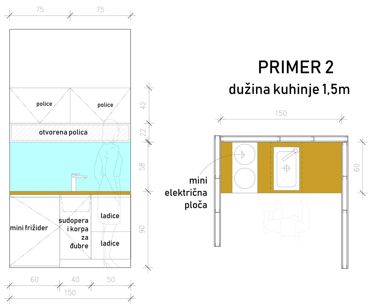 Primer 2: čajna kuhinja dužine 1,5 metara