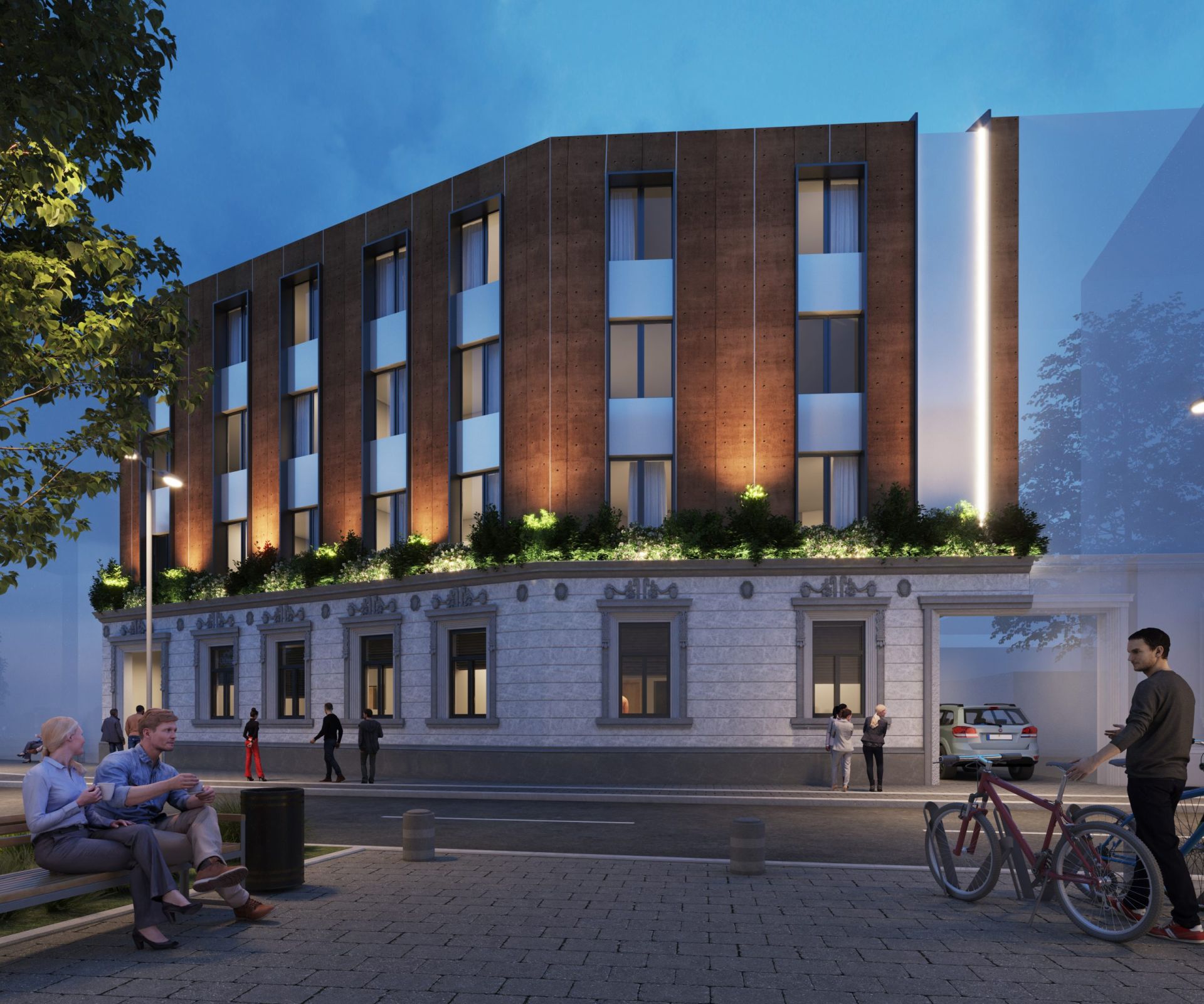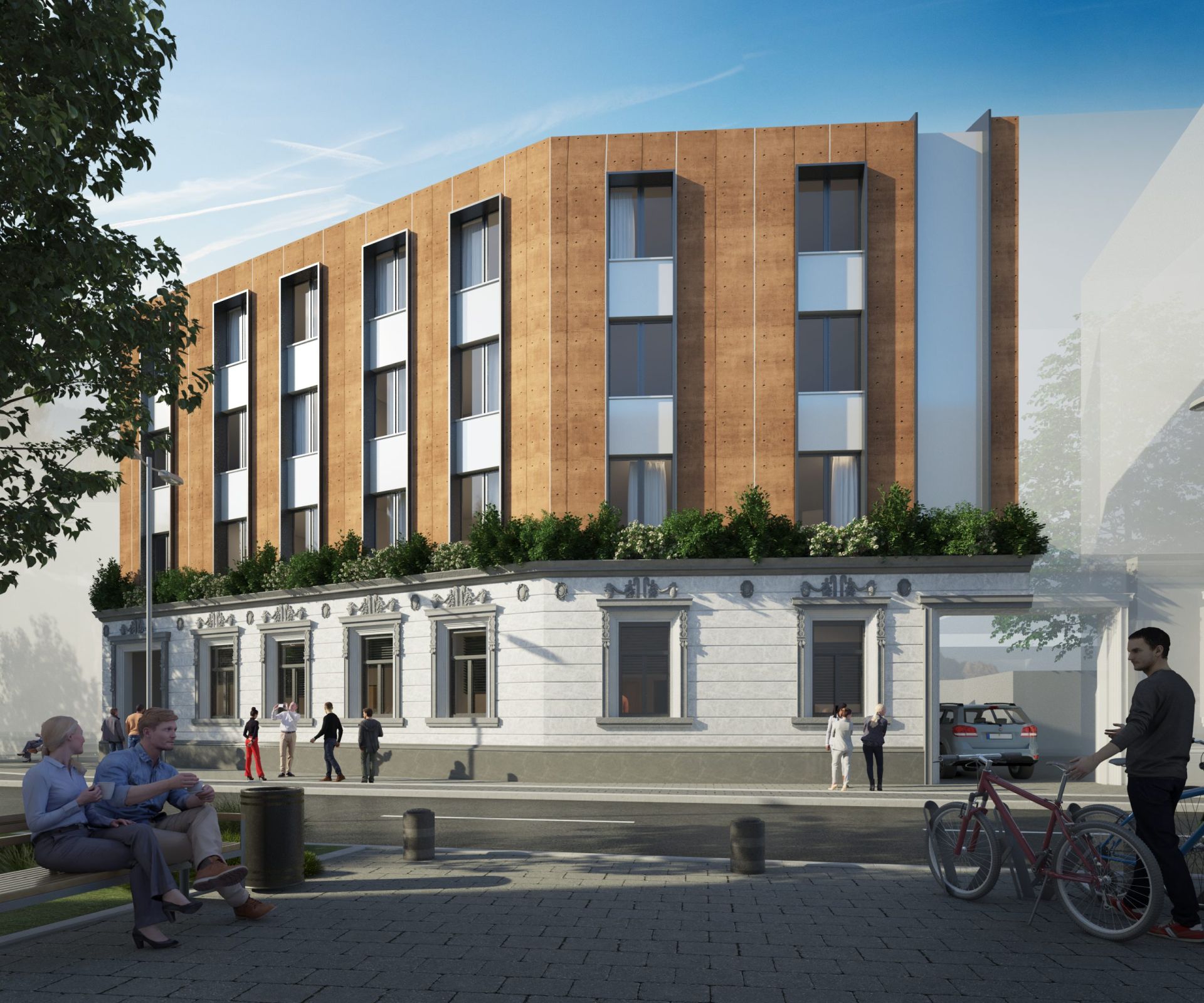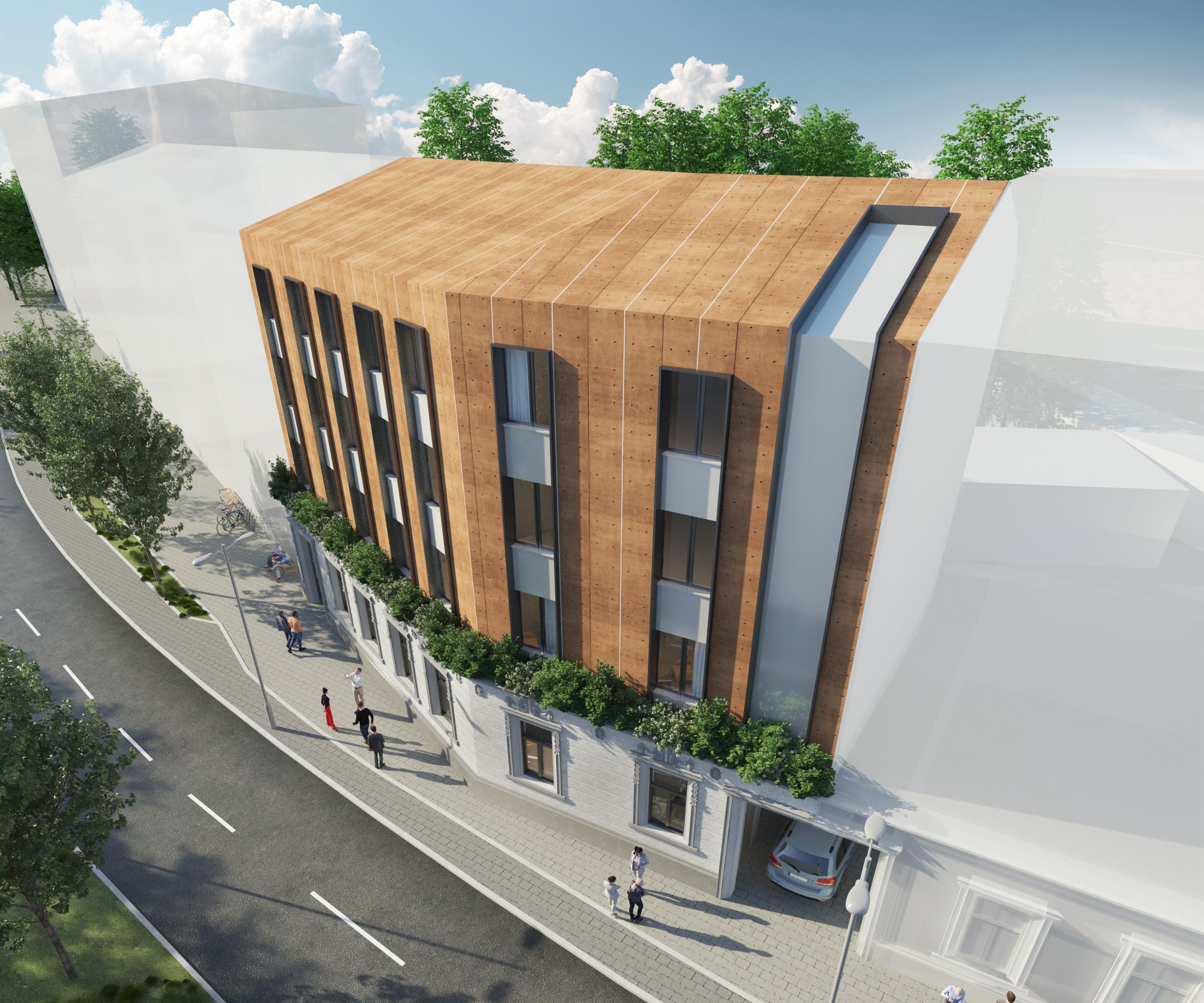 Oblikovnost korpusa naglašena je akcentovanjem prednje fasade savremenim materijalima, biranim tako da se uklope sa postojećom fasadom prizemnog objekta.