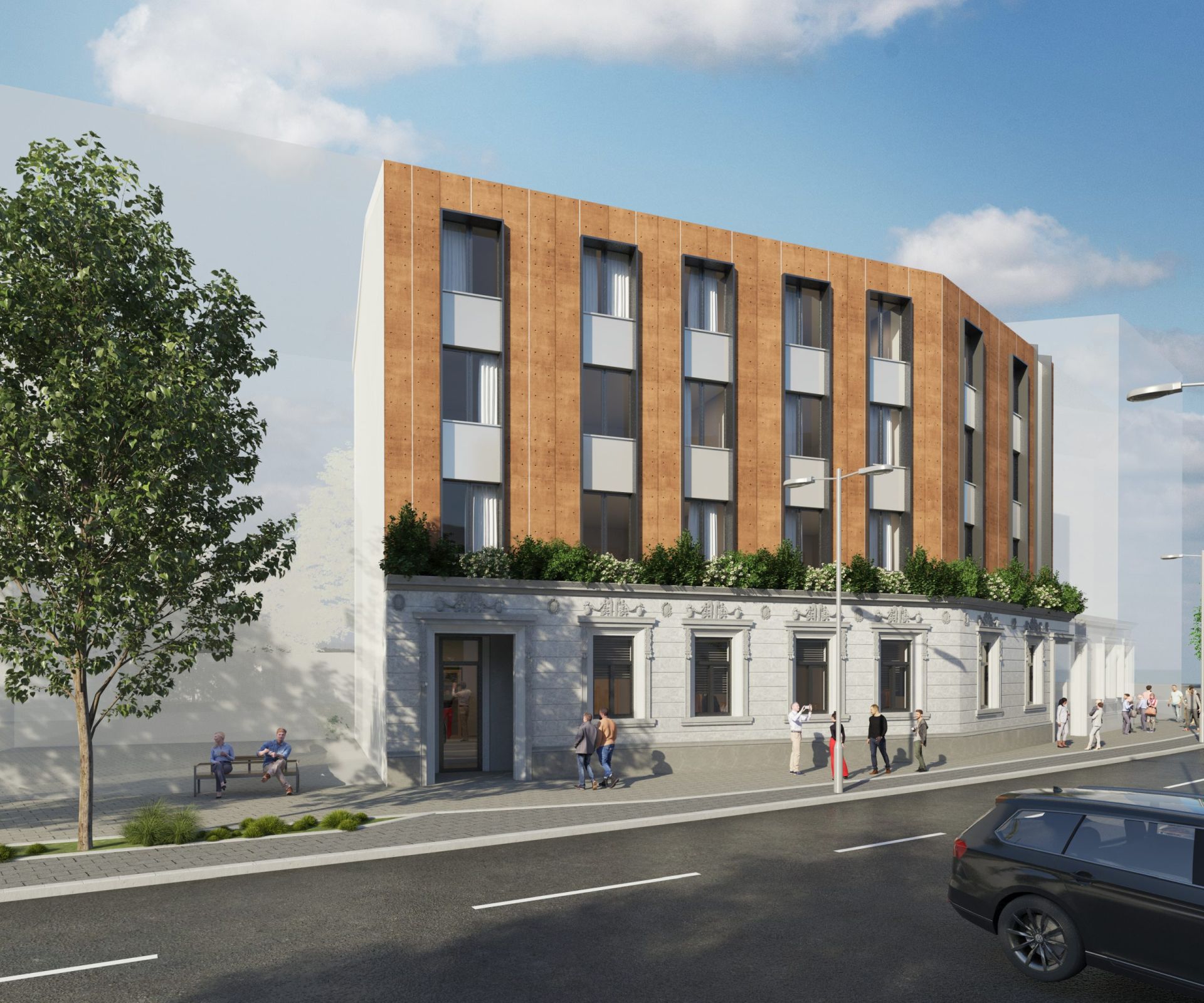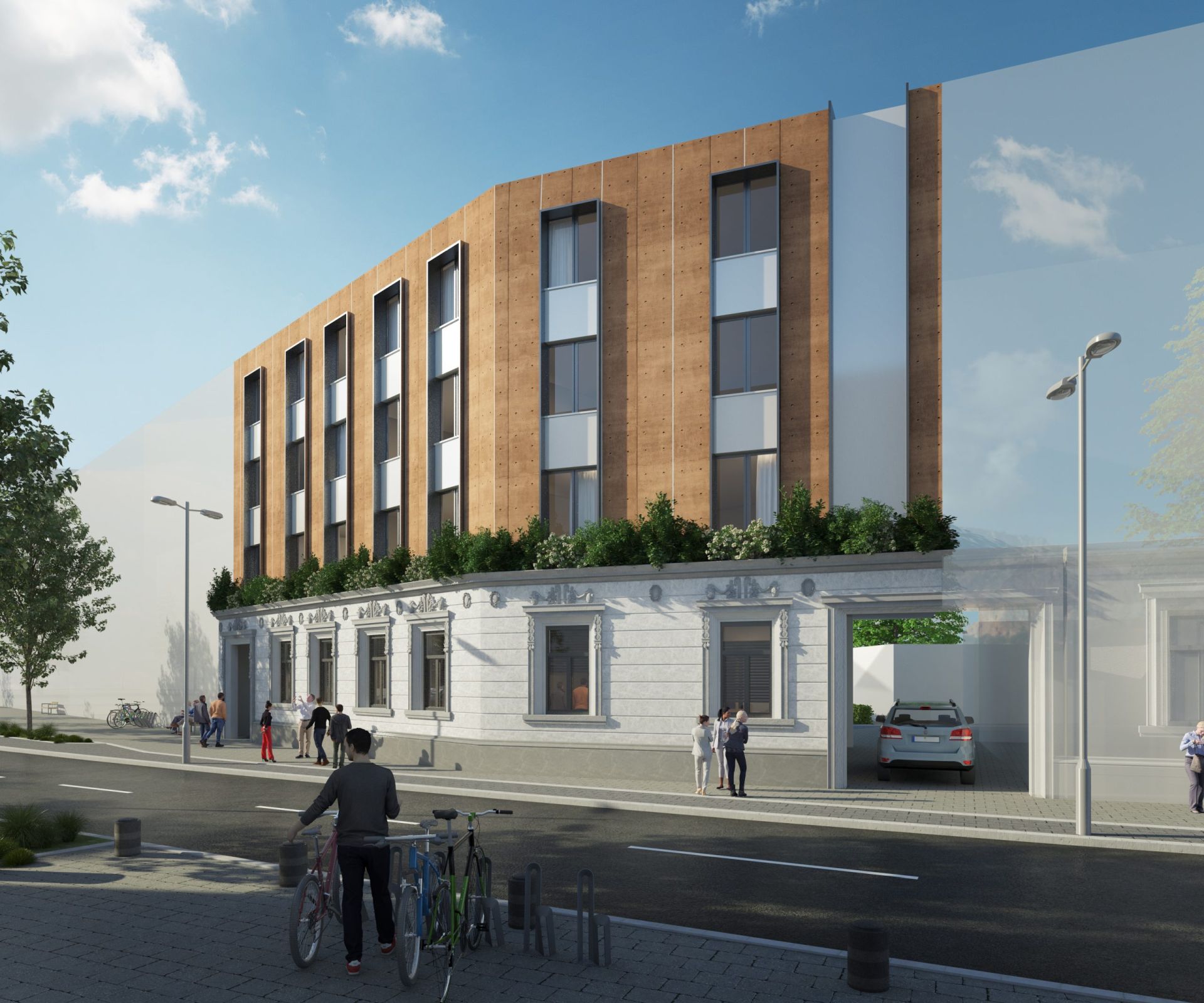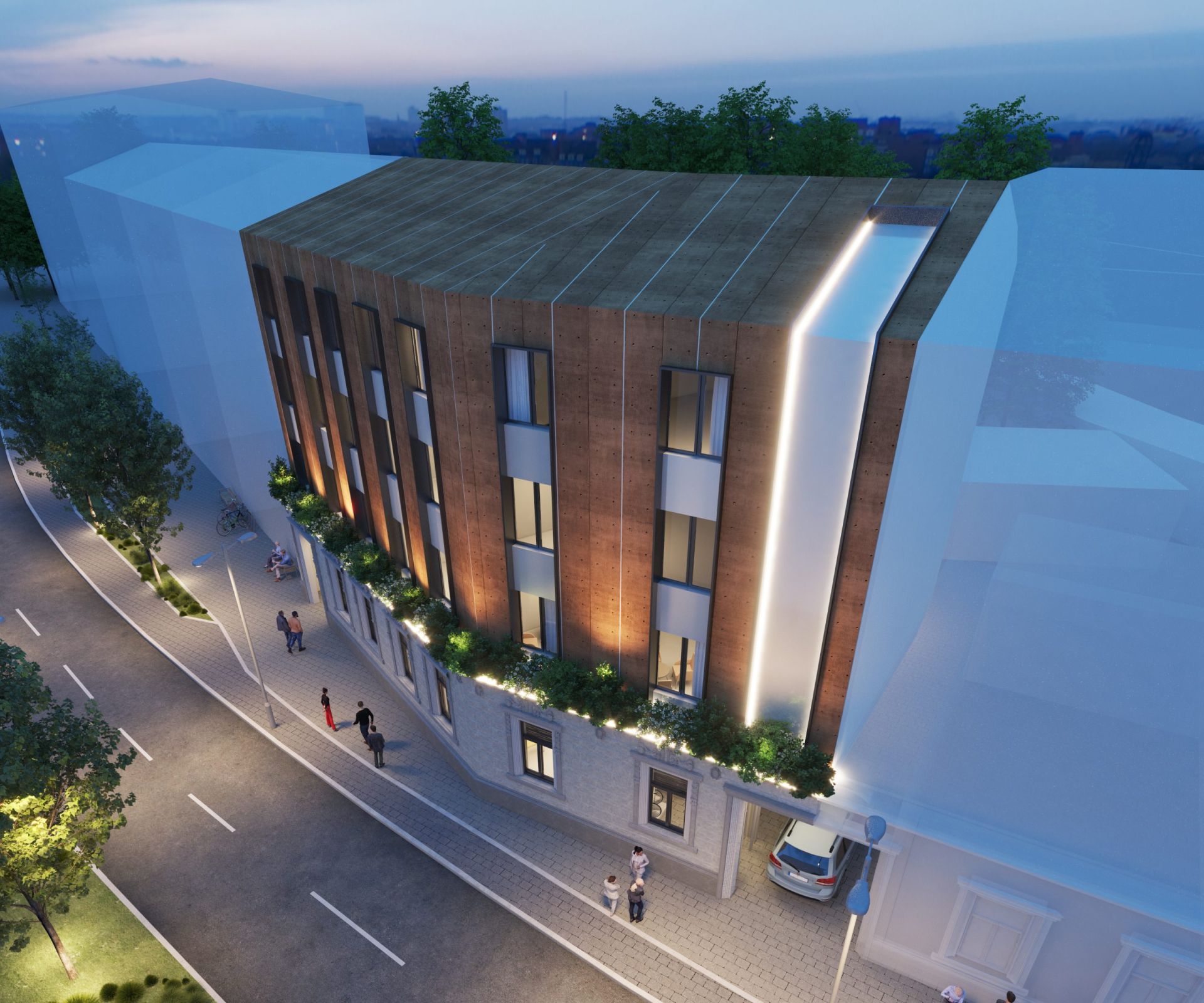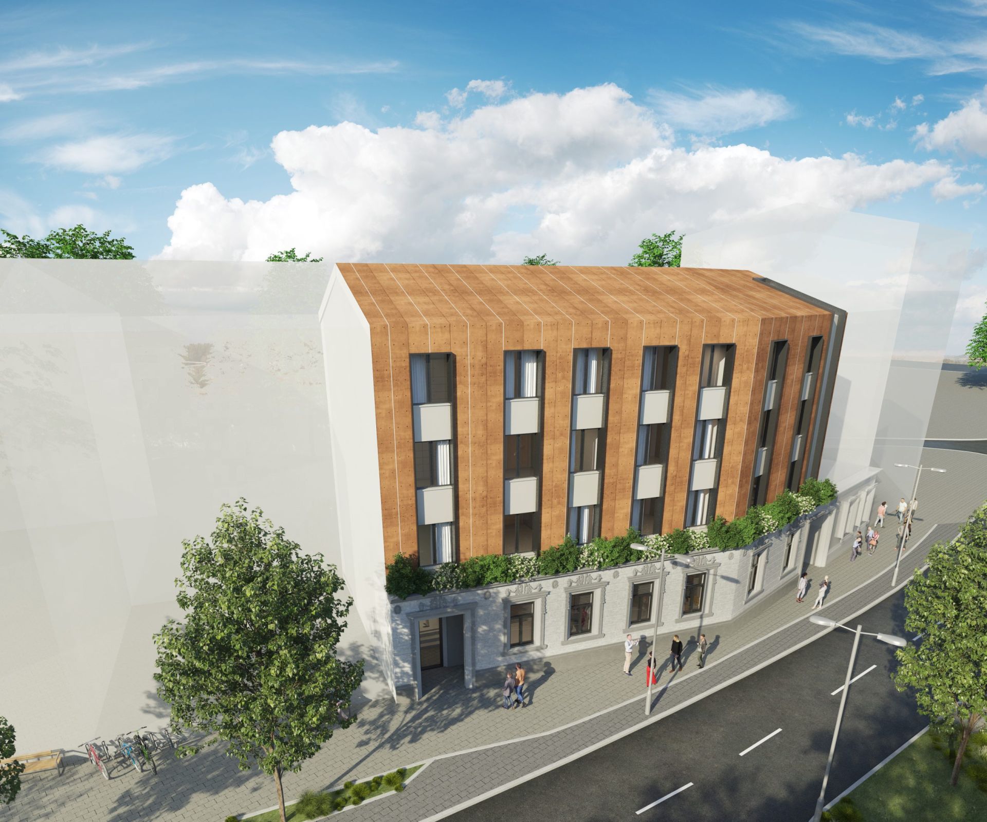 Oblikovnost korpusa naglašena je akcentovanjem prednje fasade savremenim materijalima, biranim tako da se uklope sa postojećom fasadom prizemnog objekta.