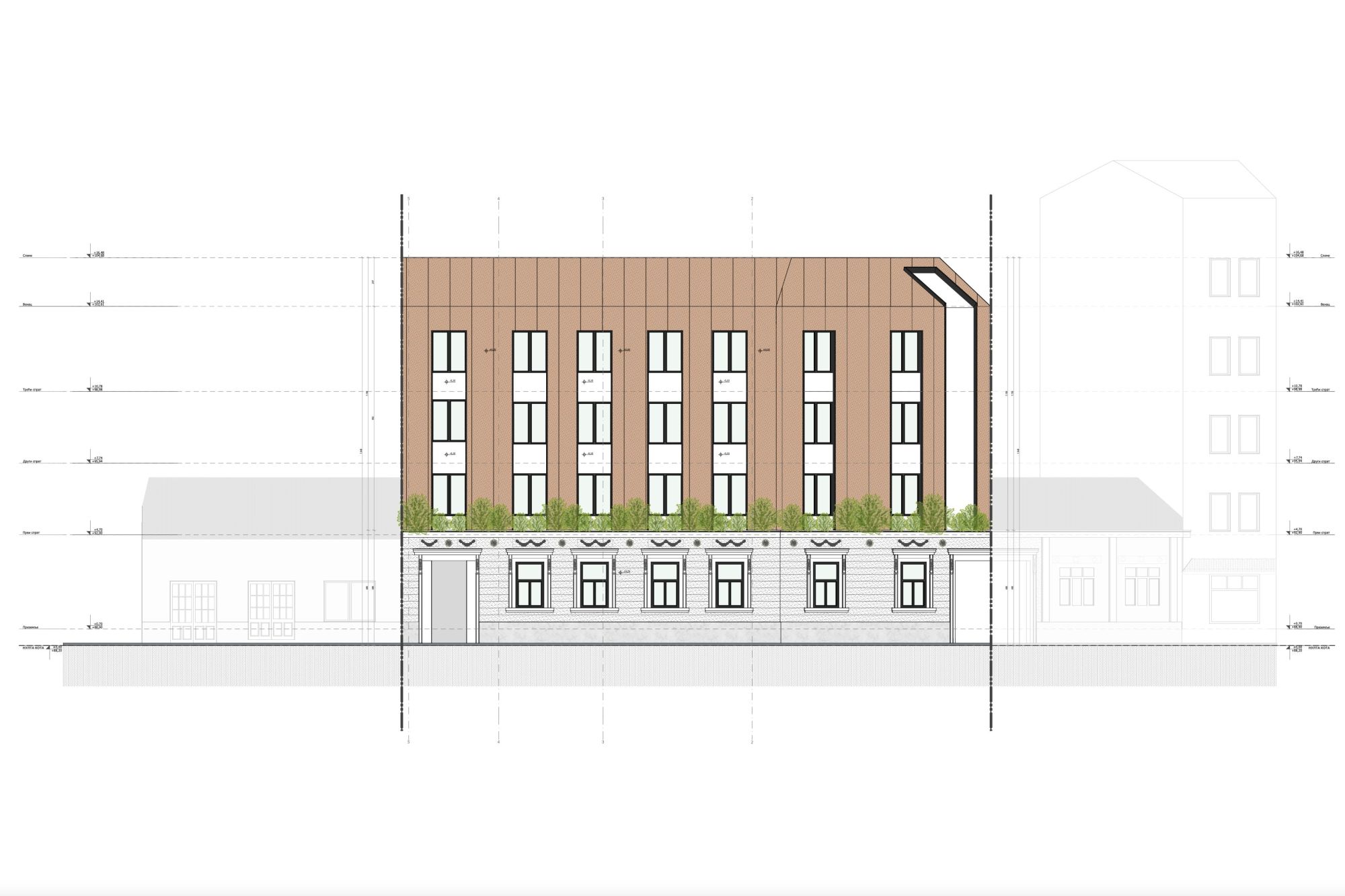 Za oblaganje fasadnih ravni u duhu vremena u kojem nastaje opredeljeni su savremeni materijali: kompozitni paneli u dva tona (iron corten i sjajno beli) i ventilisana fasada.