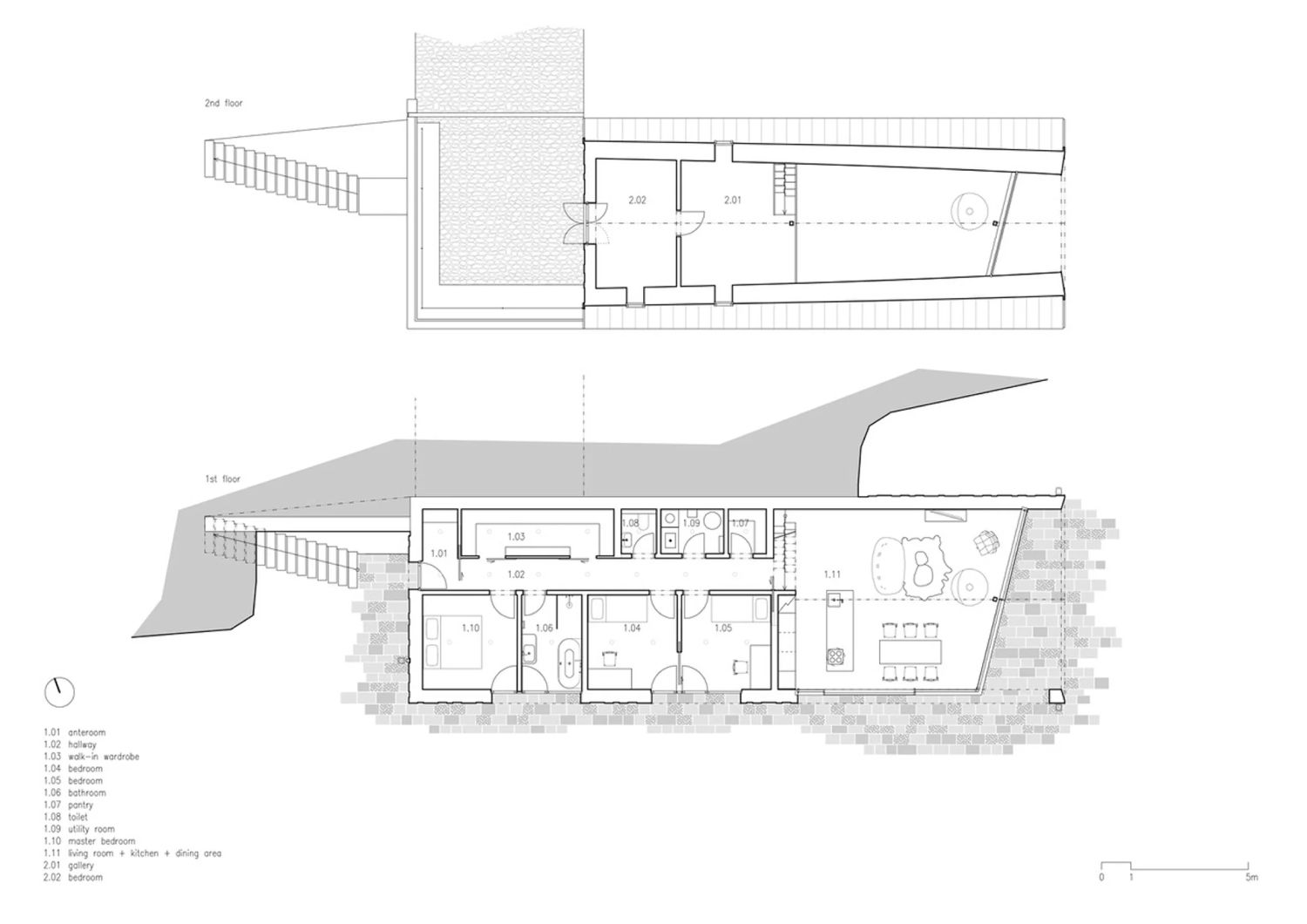 Kuća je delimično ugrađena u travnati nasip, na čijem vrhu se nalazi put koji omogućava da se organizuje direktan pristup na krov, koji jednim delom služi kao parking.