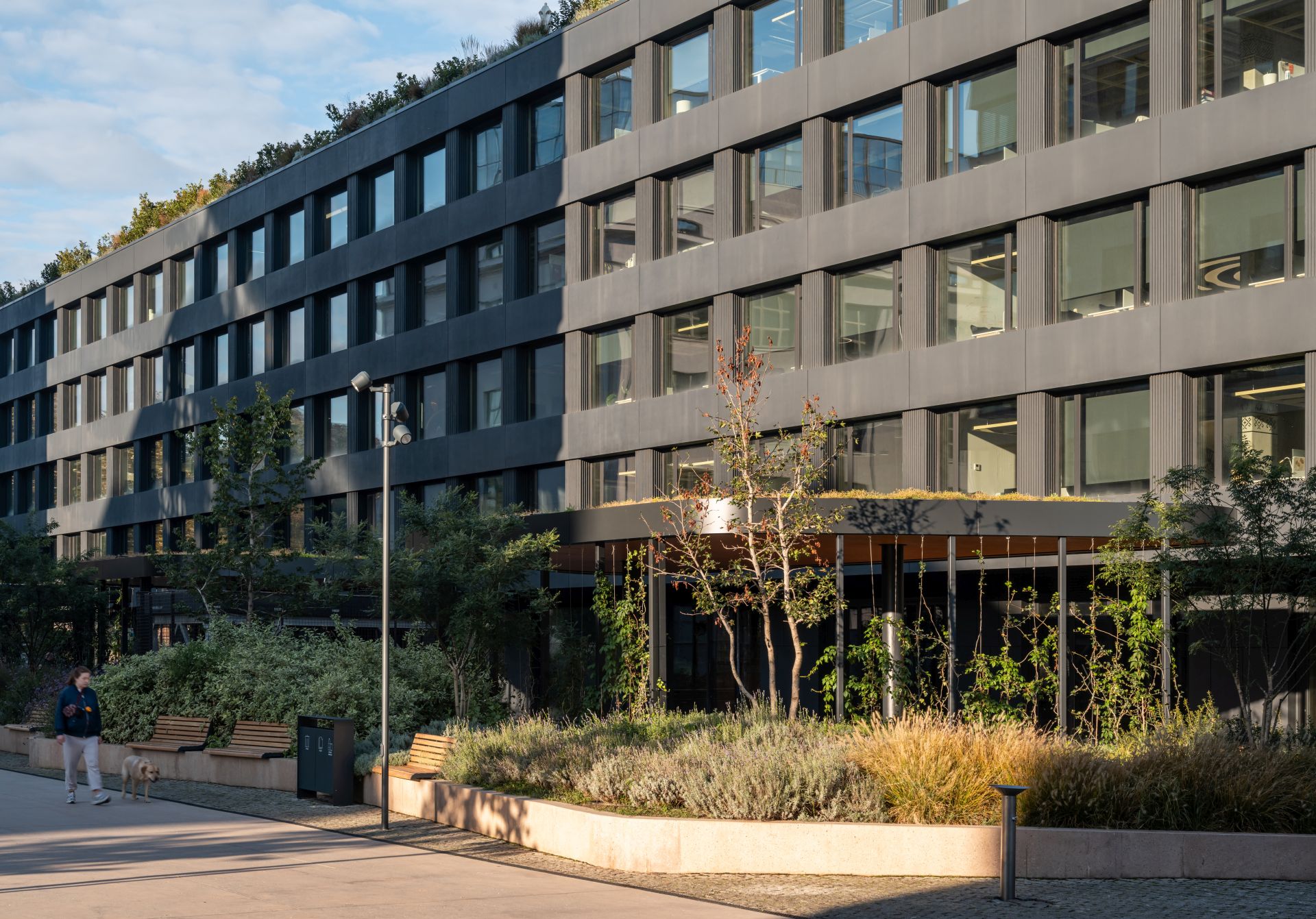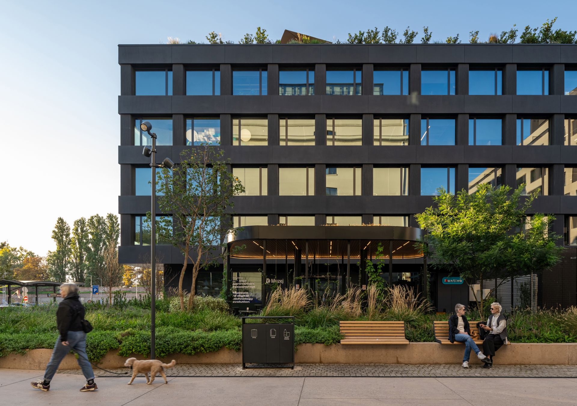 Biro FOUR+, koji su u Srbiji 2023. godine osnovale četiri arhitektkinje iz Rusije, kreirao je projekat uređenja dvorišta za kancelariju jedne IT kompanije u Beogradu. Lokacija se nalazi u poluprivatnom delu stambenog kompleksa K-District, tako da je prostor dostupan stanarima, zaposlenima u kancelariji, kao i klijentima prodavnica i restorana.