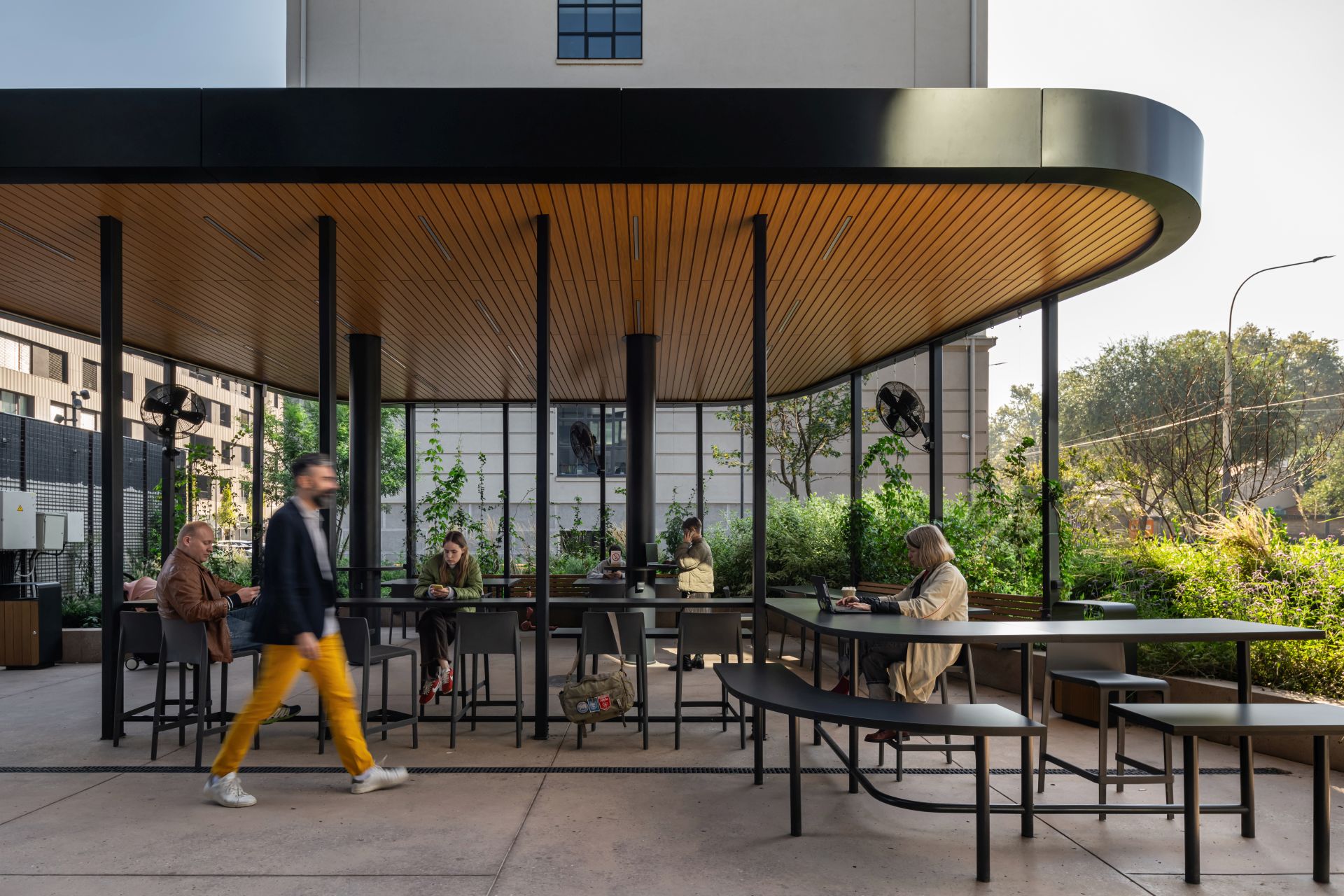 Dve nadstrešnice su posvećene coworkingu sa udobnim radnim mestima potpuno opremljenim električnim utičnicama i rasvetom.