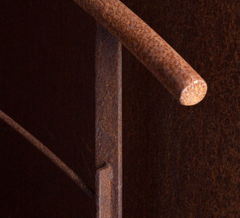 Insertacija je napravljena od kortena, čelika koji jako brzo poprima finu rđu, a koja se u kratkom vremenu stabilizuje.