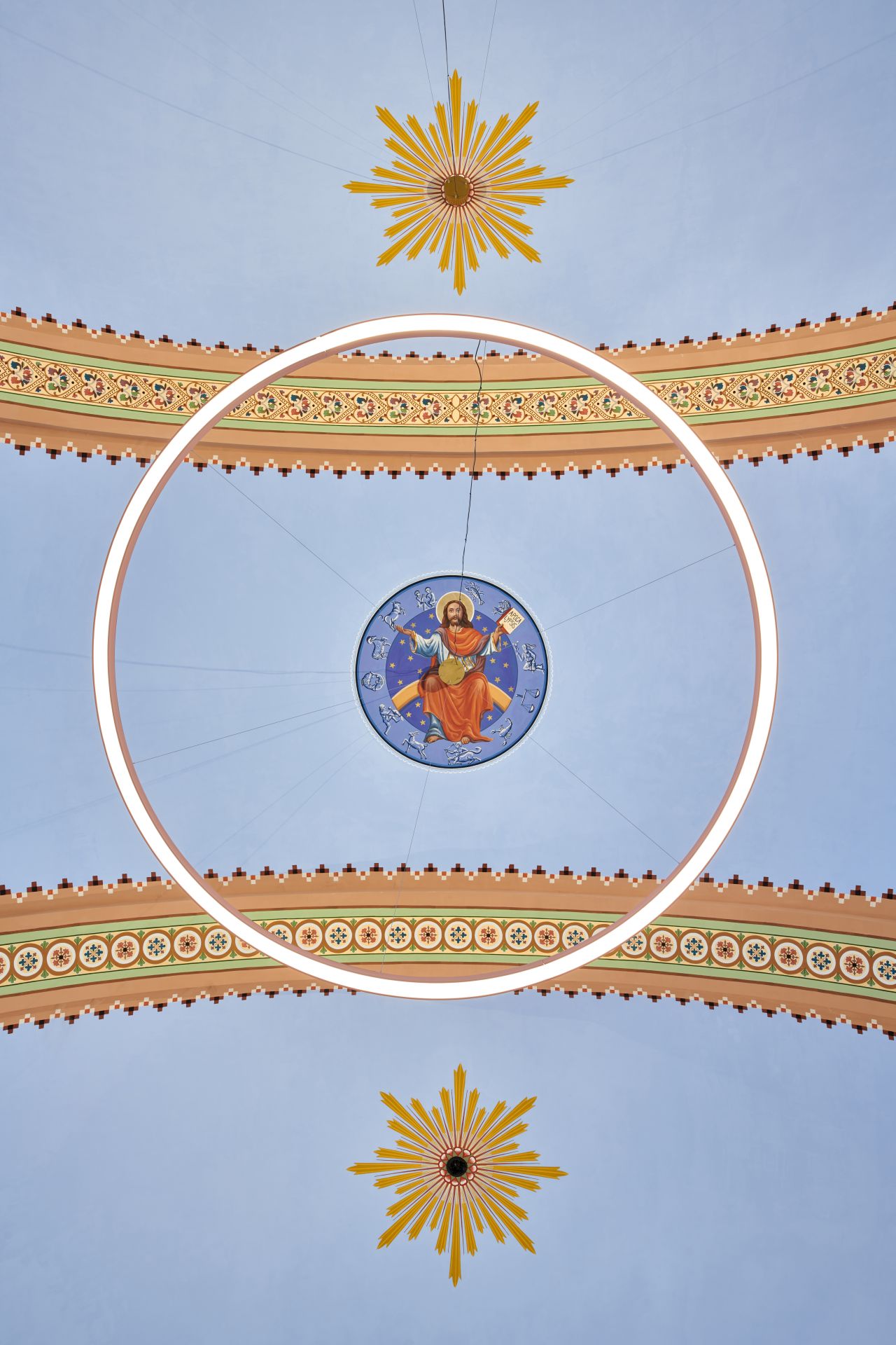 Osvetljenje je, pored skrivenih reflektora koji osvetljavaju svodove, omogućeno i preko kružnih lustera ravnih linija čija se boja utapa u kolornu šemu dekorativnog zidnog slikarstva.