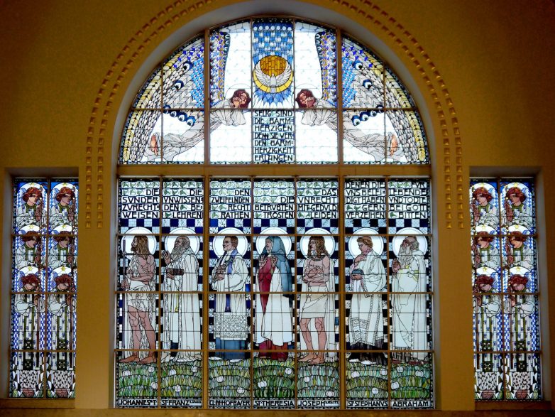 Posebna atmosfera u unutrašnjosti ostvarena je zahvaljujući vitražima na prozorima koji su delo Kolomana Mozera, poznatog austrijskog slikara i grafičara, jednog od osnivača bečke secesije. Dragoceni vitraži su za vrema Drugog svetskog rata sklonjeni sa prozora crkve i prebačeni u Čehoslovačku na čuvanje, ali su 1950. godine vraćeni i ponovo postavljeni.