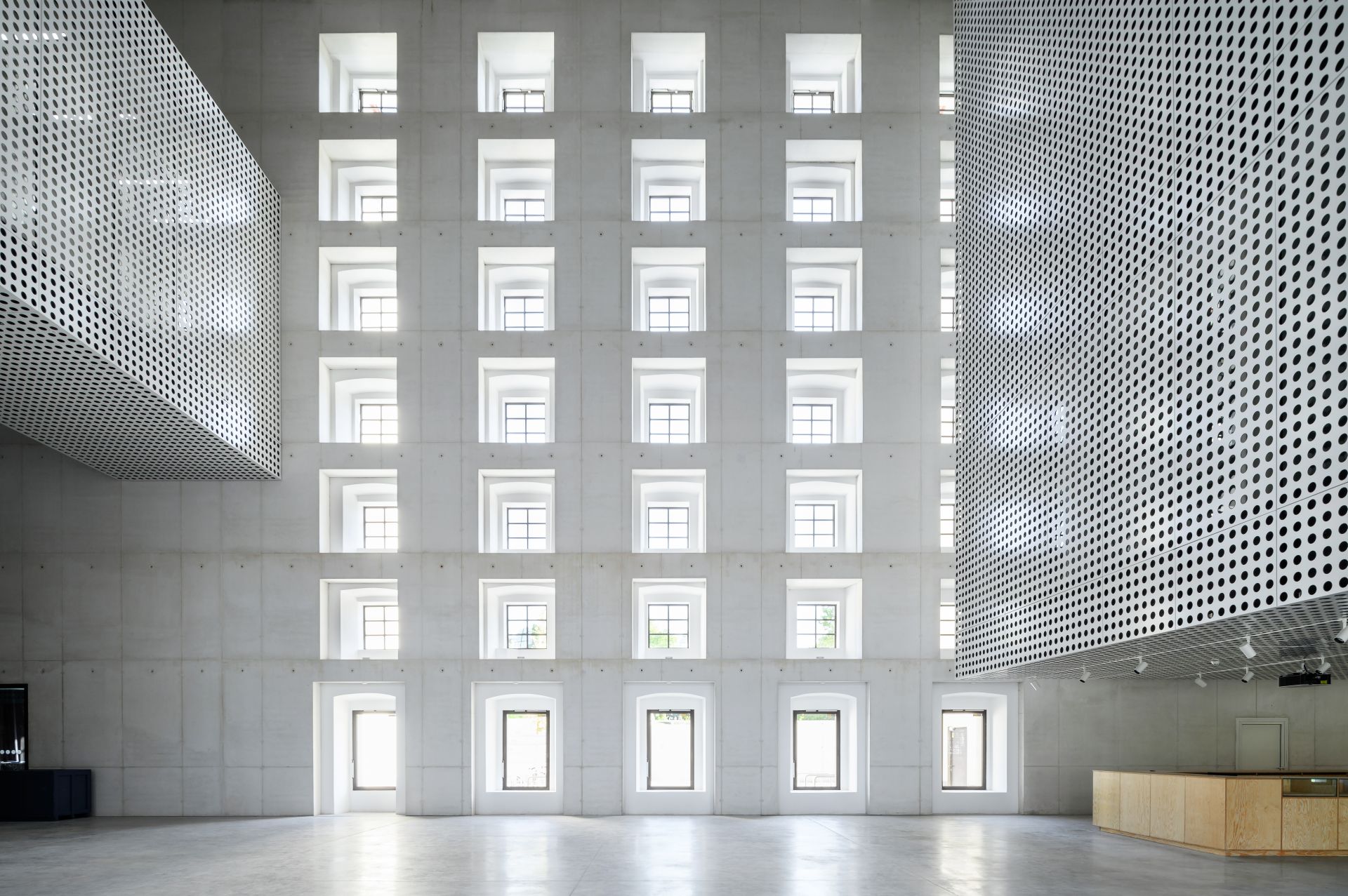 Plutajuće kocke su obložene perforiranim limom, koji, pored jedinstvenog estetskog karaktera koji unosi ujednačen izgled novih prostornih intervencija, ispunjava i funkcionalne zahteve: ispod njega se krije zvučna izolacija koja upija odjeke u prostranoj galeriji i delu mašinske instalacije.