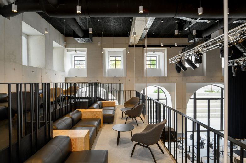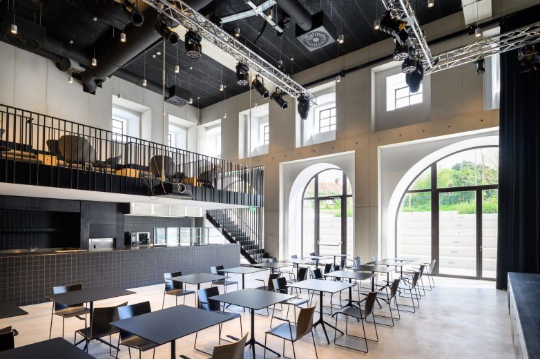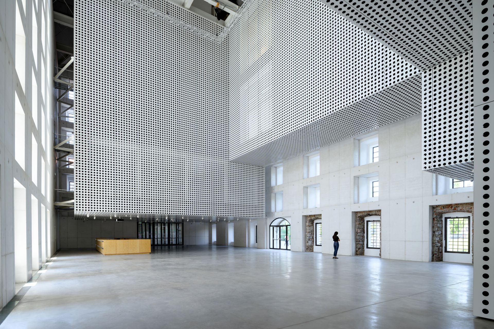 Savremena intervencija u ispražnjenom enterijeru Cukrarne – dva galerijska volumena u kojima je smešten veći deo programa – tako je okačena na novu betonsku konstrukciju i ni na koji način ne opterećuje prvobitni zidani obod.