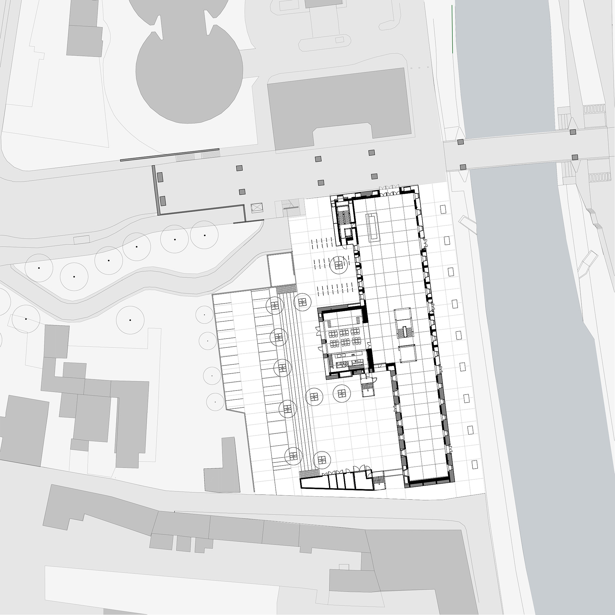 Glavni ulaz u zgradu uređen je sa strane reke, a platforma ispred njega povezuje pešačku i biciklističku stazu koja vodi Poljanskim nasipom i ujedno pruža odličnu kulisu za dešavanja na otvorenom.