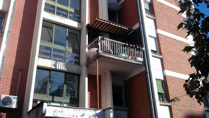 Terasa na Novom naselju u Novom Sadu, na inače veoma lepoj fasadi, nedavno je osvanula tako što je nepoznati počinitelj konstrukciju podupro metalnim stubićem preseka 2 x 2 centrimetara.
