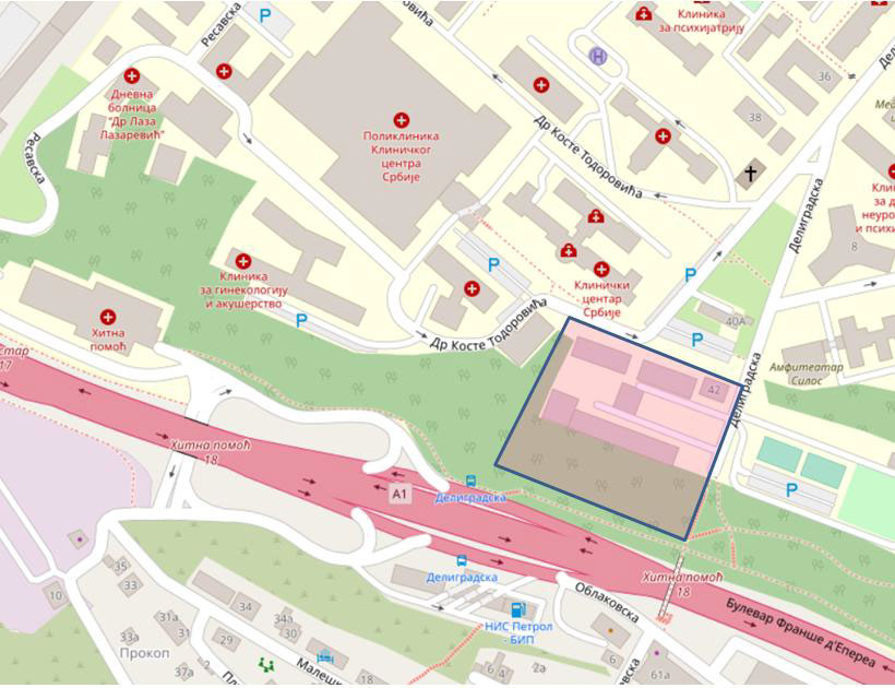 Građevinska parcela na kojoj će kompleks biti građen sastoji se iz dva dela: prostora koji zauzimaju postojeći objekti i dela zaštitnog zelenila pored autoputa. Prizemlje formira ulazne pjacete prema ulici Dr Koste Todorovića, povučeno je od regulacije, dok su nadzemne etaže manjeg gabarita i razvijene u obliku latiničnog slova H. Dopunsko prirodno osvetljenje i provetravanje suterenskih i prizemne etaže omogućeno je formiranjem četiri atrijuma.