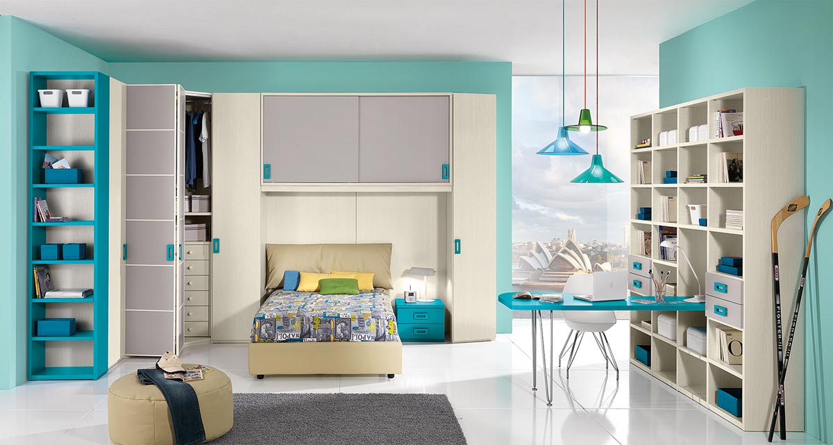 Dva kreveta i prostor za odlaganje može da se smesti i u manju prostoriju. Dimenzije bloka sa slike ispod u beloj i tirkiznoj boju su svega 2,53×3,53 metra i idealna je za uređenje malog prostora.