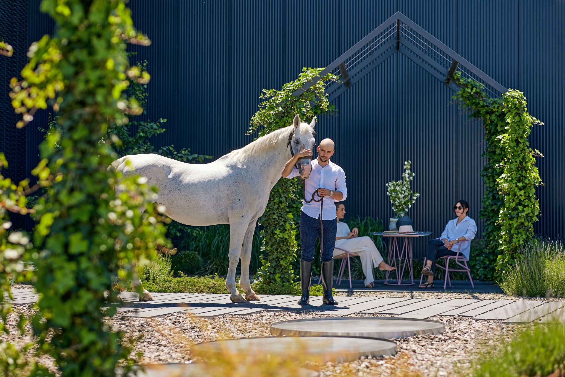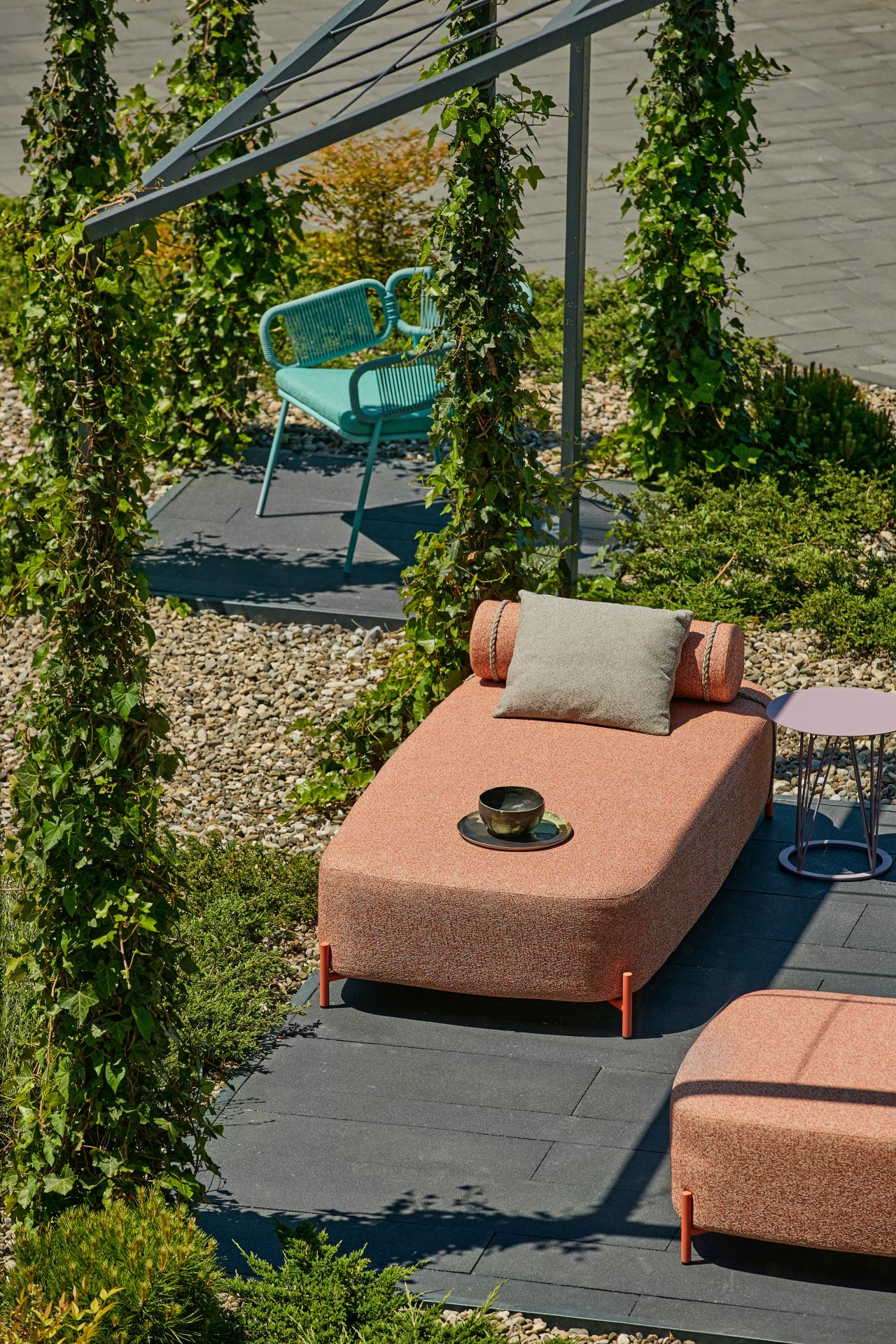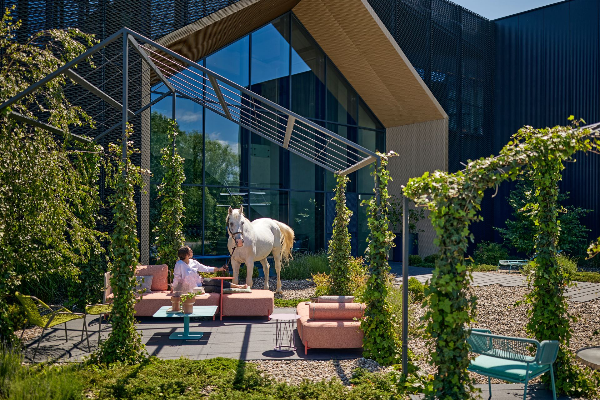 Nasuprot crnoj, kao svojevrsni opozit, smešteni su raznobojni komadi dizajniranog spoljašnjeg nameštaja, formirajući udobne, prefinjene i suptilne mikroambijente.