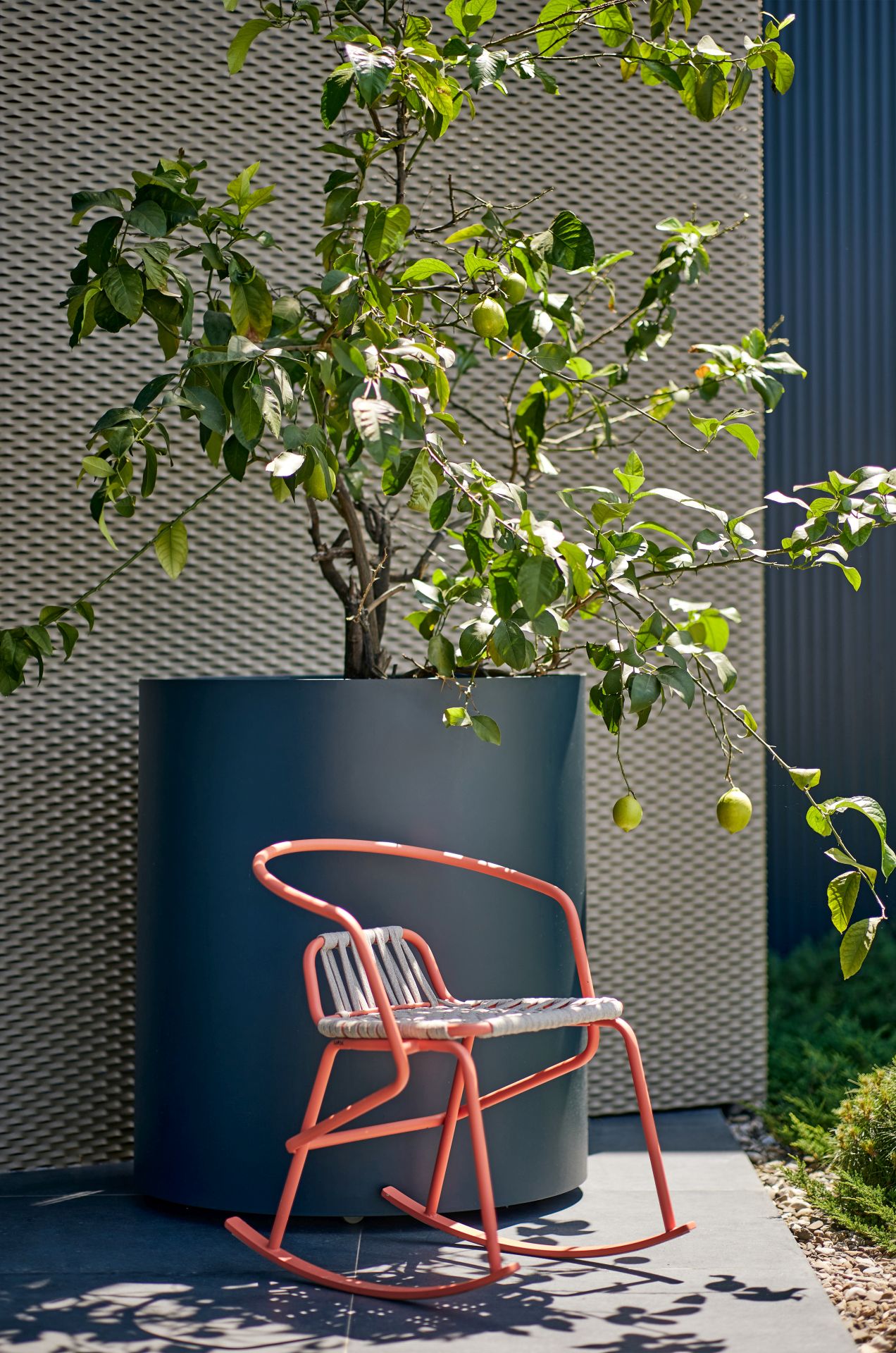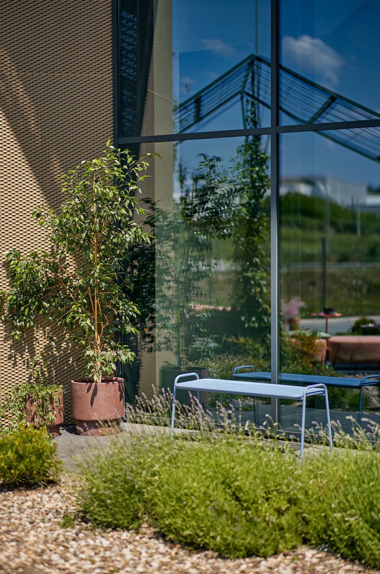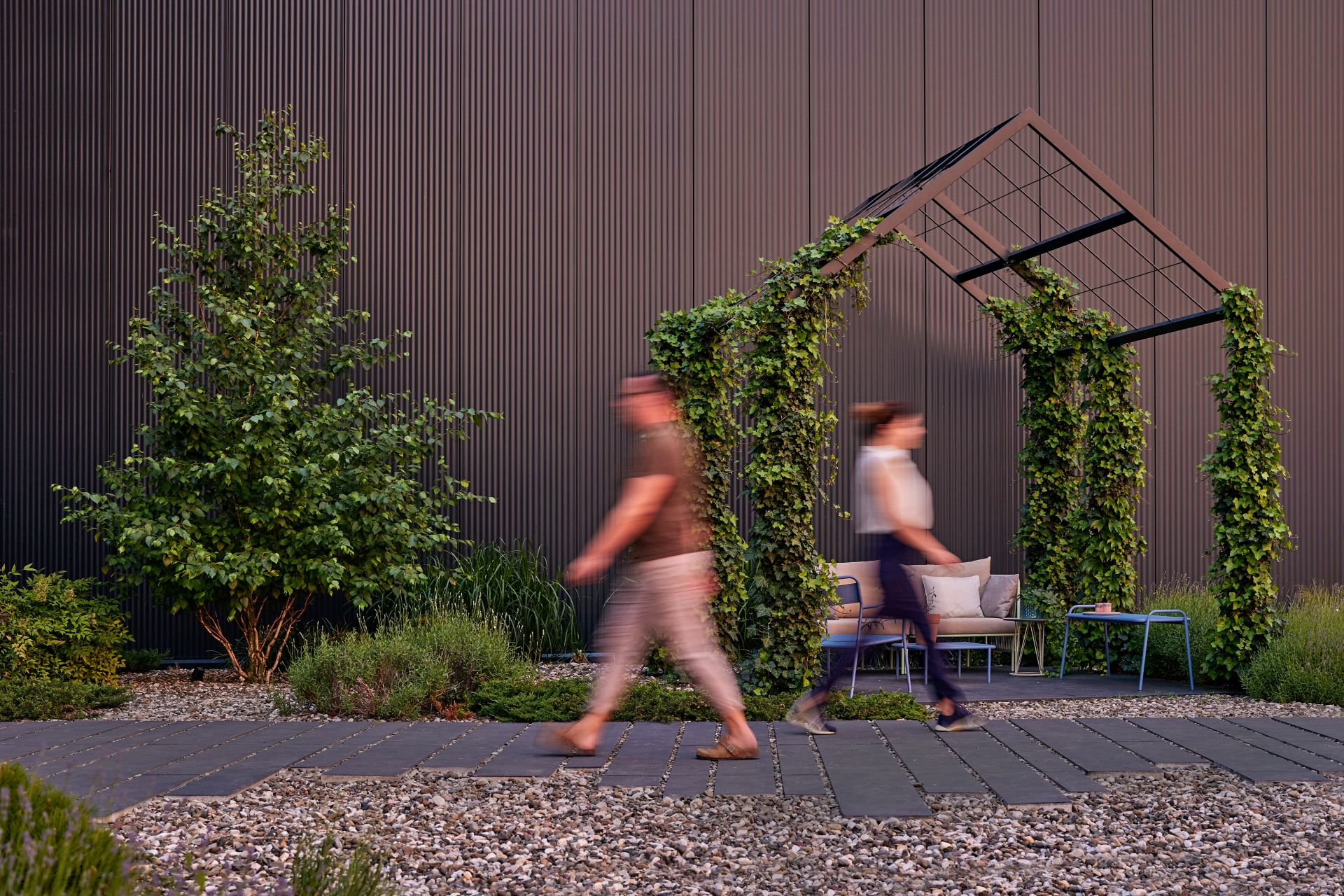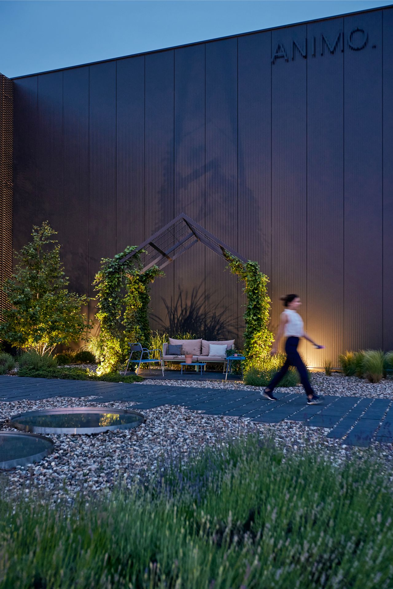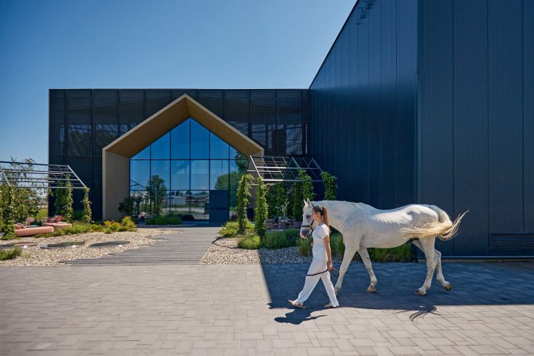 Međutim, dizajneri se nisu zaustavili na izboru crne boje za sam objekat – ona se razliva i pretače na eksterijer – na metalne strukture, ulazna vrata, logo kompanije, popločane površine, akcentovanu široku razigranu stazu, keramiku na ulazu, posude za biljke.