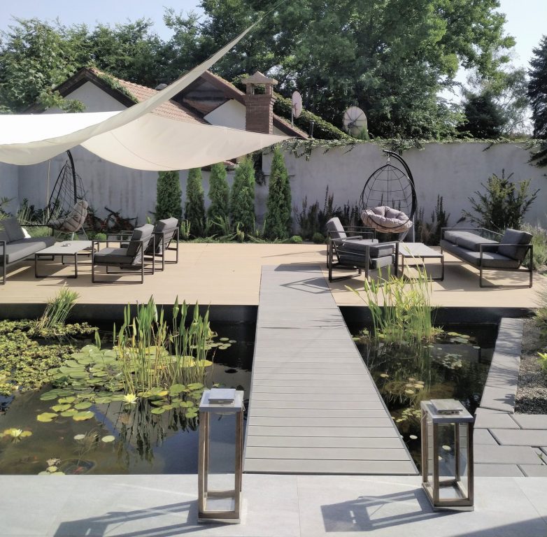 Za razliku od arhitekture, velika pažnja posvećena je parternom uređenju. U zadnjem delu dvorišta, nalaze se dve velike terase koje su povezane malim, ali bogato uređenim jezercetom i raznorodnim zelenilom. Pristupni plato je, takođe, atraktivno oblikovan i uređen. Prema svojoj raznolikosti, dvorište je pravi mali raj. Ali, to nije sve.