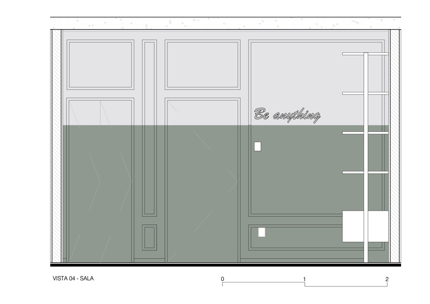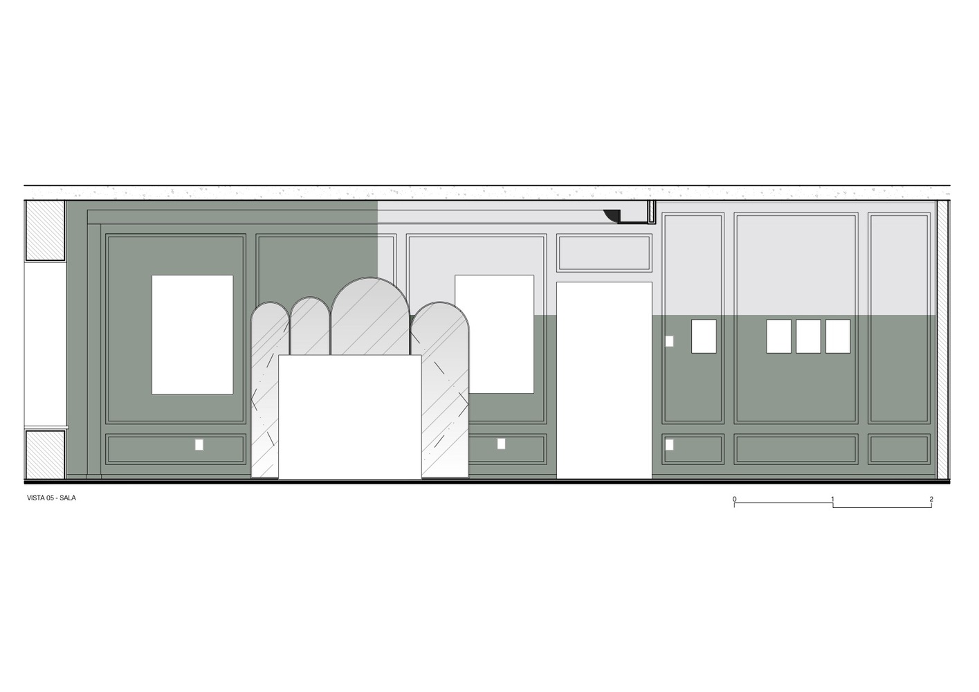Štukature se spajaju sa cevima duž plafona i zidova kako bi se neutralisale, dok su ostale prostorije su naglašene geometrijama u jakim bojama, ističući uokvireno umetničko delo.