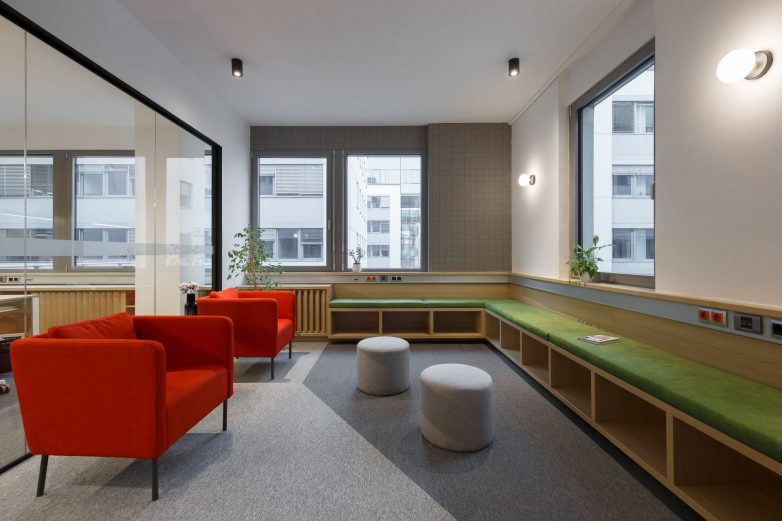Uključivanjem drvenih obloga i nameštaja, prostor je dodatno obogaćen prirodnim materijalom, koji pravi balans između uređenog kancelarijskog prostora i toplog okruženja za boravak zaposlenih.