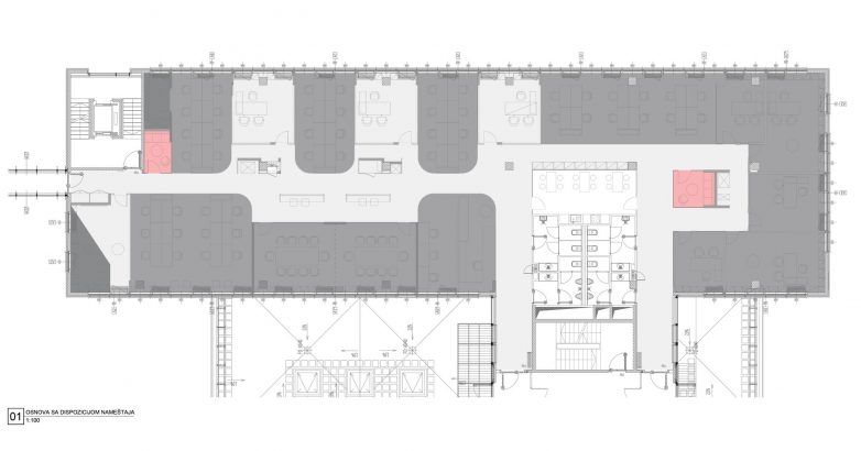 Sam blok objekta je optimalne širine i dvostrane orijentacije, te je bilo moguće kreiranje otvorene osnove sa centralnim koridorom i radnim mestima sa obe strane koridora.