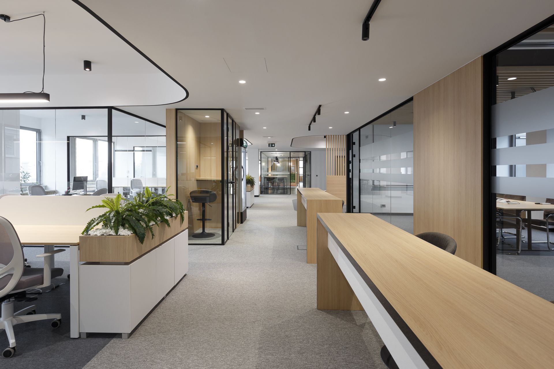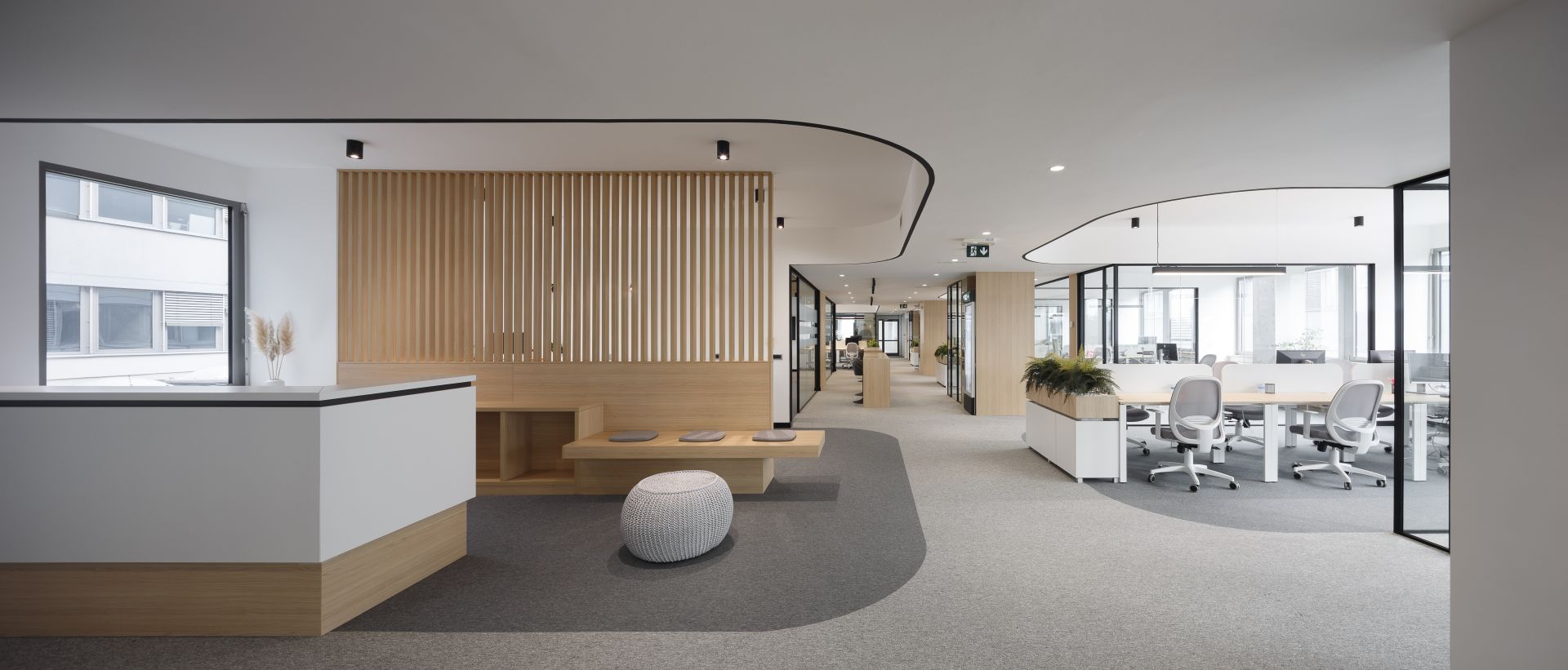 Uključivanjem drvenih obloga i nameštaja, prostor je dodatno obogaćen prirodnim materijalom, koji pravi balans između uređenog kancelarijskog prostora i toplog okruženja za boravak zaposlenih.