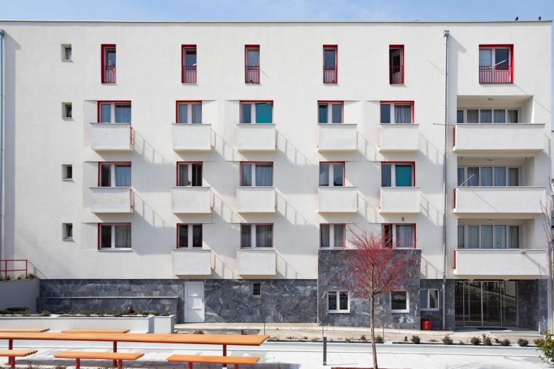 meni je prvo velika dubioza da je ova rekostrukcija koštala čak četiri miliona evra , čoveče? drugo dvorišno rešenje ne postoji, čist nihilizam, katastrofa. ovo je betonska ploča sa svadbarskim stolom, klupama i dva drveta čini mi se ukrasa crveni prunus ili acer ne mogu da provalim, zaista strašno, valjda će te ljude neko da posećuje deca, unuci, prijatelji i leti i na jesen, zimi jer nema nikakve ni najmanje nadstrešnice, neki izolovani intiman kutak ili neki centralni gazebo da se ljudi zaštite od kiše, sunca u kranjem slučaju, da se održi neki koncert, poetsko veče…. stvarno ne razumem da ovako bude sklepano , a da akcenat bude u objašnjenu zamisli na fasadnim crvenim momentima tkz zakošenim crvenim špaletnama, čoveče koga to zanima i za koga se ovaj objekat radio??
