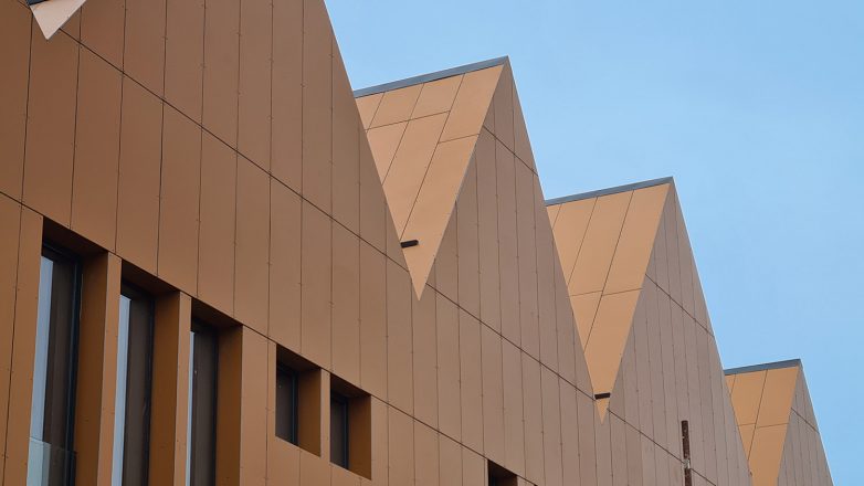 “Ležeći oluci na spoju kosina krova bili su veoma kompleksan detalj za izvođenje”, kaže Đorđe Bajilo za naš portal i dodaje da se Fundermax ploče na krovu su samo maska. “Ispod se nalaze slojevi krovne membrane i izolacije, a voda teče neometano ispod ploča do ležećih oluka.”