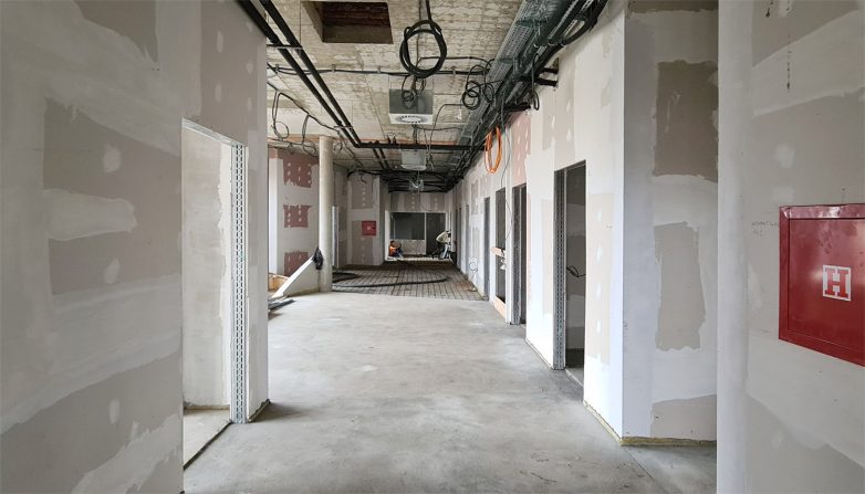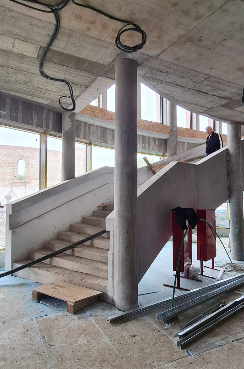 U unutrašnjosti objekta zatekli smo majstore koji rade na završnim radovima. Postavljena je instalacija, formirani su zidovi i u većem delu objekta izvedena je cementna košuljica. Enterijerom će dominirati velika visina prostora od oko 3,4 metra kao i stepenišni krak koji prati valovitu fasadu.
