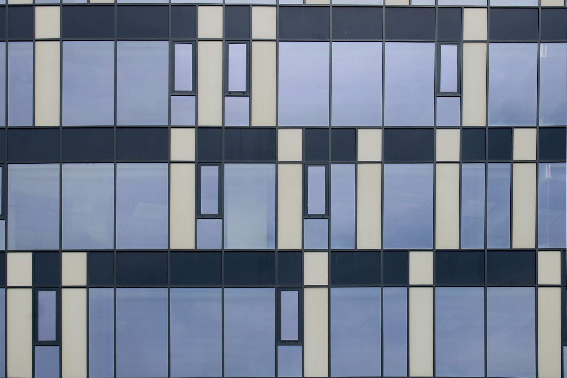 Dualizmom “tamnih” i “svetlih” panelnih površina primenjene “zid-zavese” suptilno su naglašene horizontalne zone međuspratnih konstrukcija i unutrašnjih prostora čistih visina. Jedan naizgled strog, rigidan i ponavljajući shematizam panelnih polja ublažen je na dva načina.