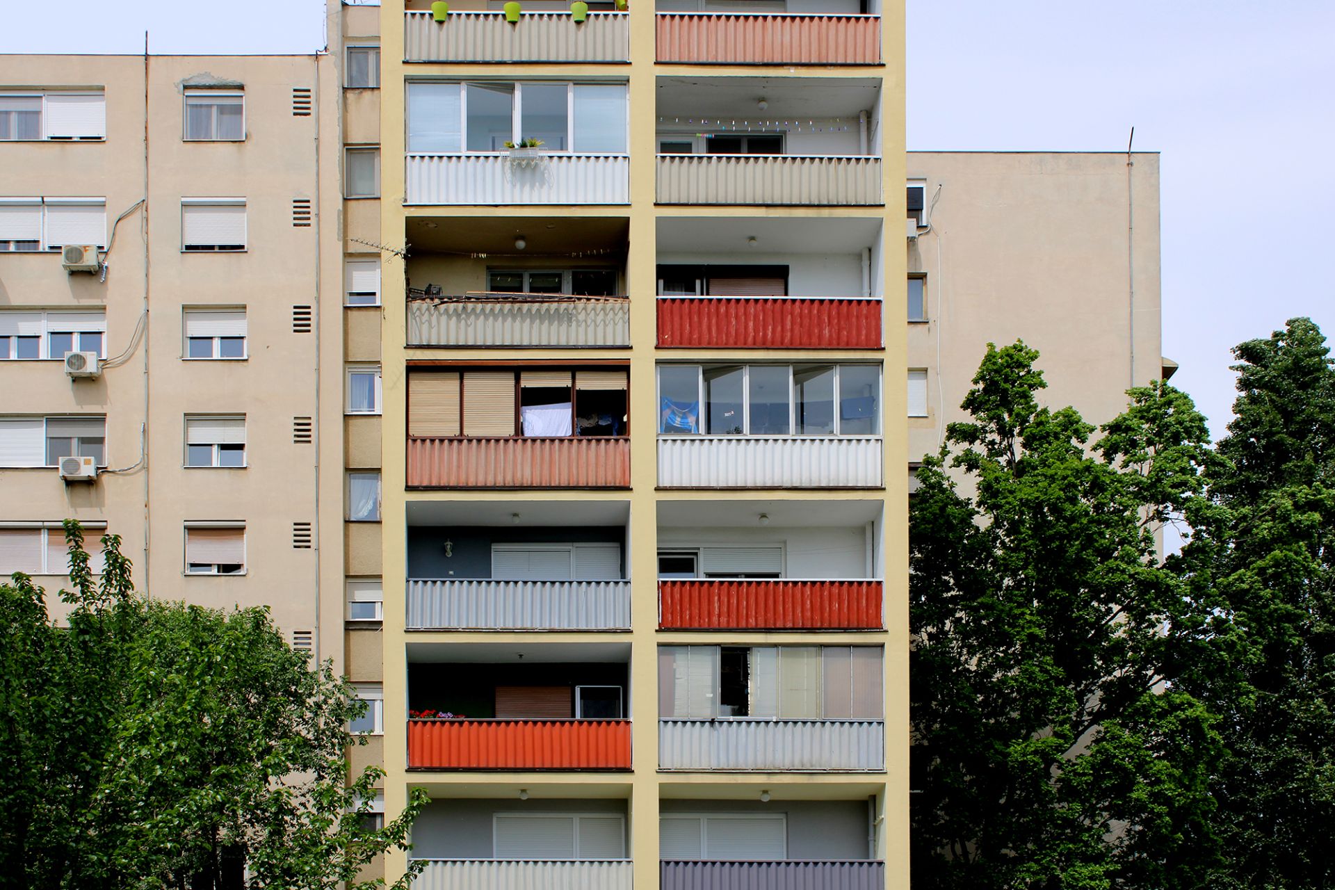 Detalj fasade stambene kule sa koloritnim aluminijumskim ogradama (Arh. Rista Šekerinski); Foto: Dr Goran Anđelković, u. d. i. a.