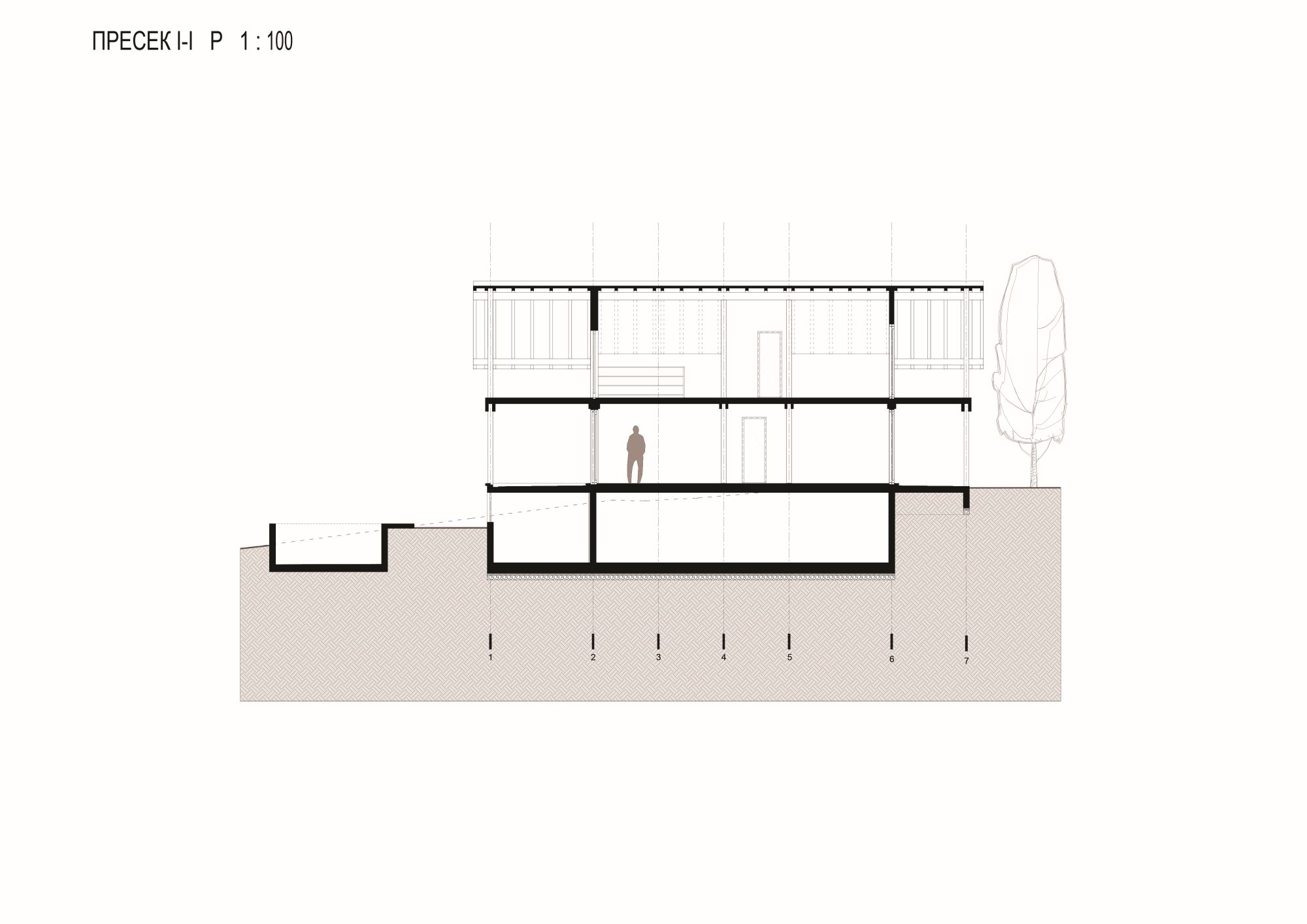 Arhitekta Lalicki sledi koncept „kotobanje“, pa prirodni pad terena koristi za formiranje podrumske etaže, a nad njom parternu strukturu sa prostranim tremom i prizemljem, dok u potkrovlju smešta galeriju.