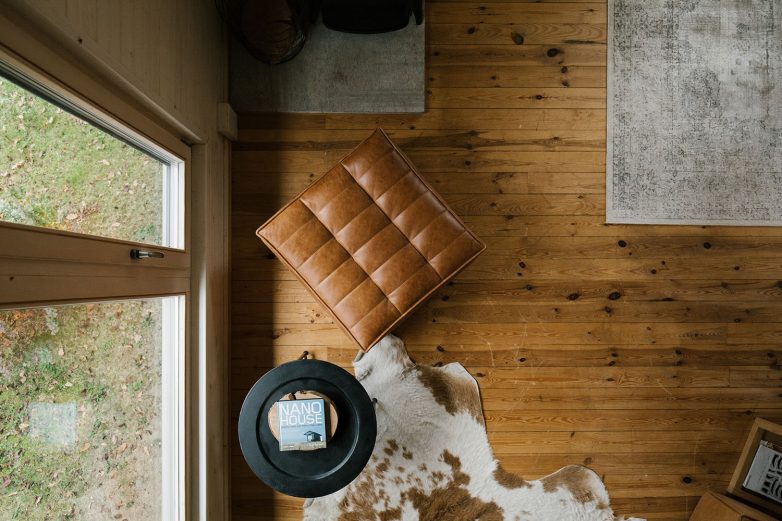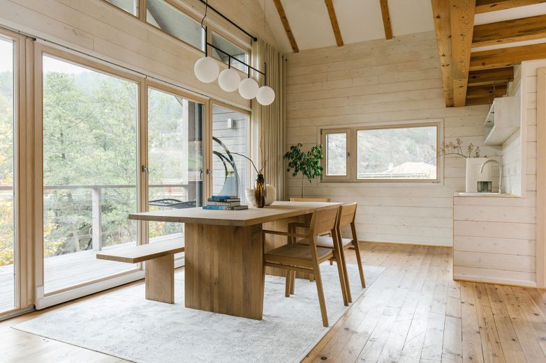 Za konstrukciju i podne obloge je drvo zadržalo svoj prirodni ton i time predstavlja osnovu estetike projekta, dok se za zidnu oblogu drvo toniralo u svetlije nijanse. Tretmanom površina pažnja korisnika se usmerava na okruženje koje se oslikava u prozorskim otvorima značajnih dimenzija. „Da bi se zadržao osnovni koncept upotrebe prirodnih materijala, u dnevnoj zoni su odabrani komadi nameštaja brenda Ethnicraft u koži kamel boje“ – dodaje Rašković.