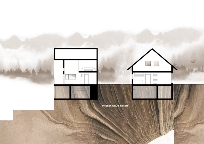 Prvi je suterenski deo koji se koristi u toplijim mesecima, te je zbog pada terena jednim delom ukopan u zemlju. Drugi deo je boravišni, gde su arhitekta i klijent realizovali zamisao da se velikim prozorskim otvorima na prednjoj fasadi unutrašnjost poveže s prirodom i predelom.