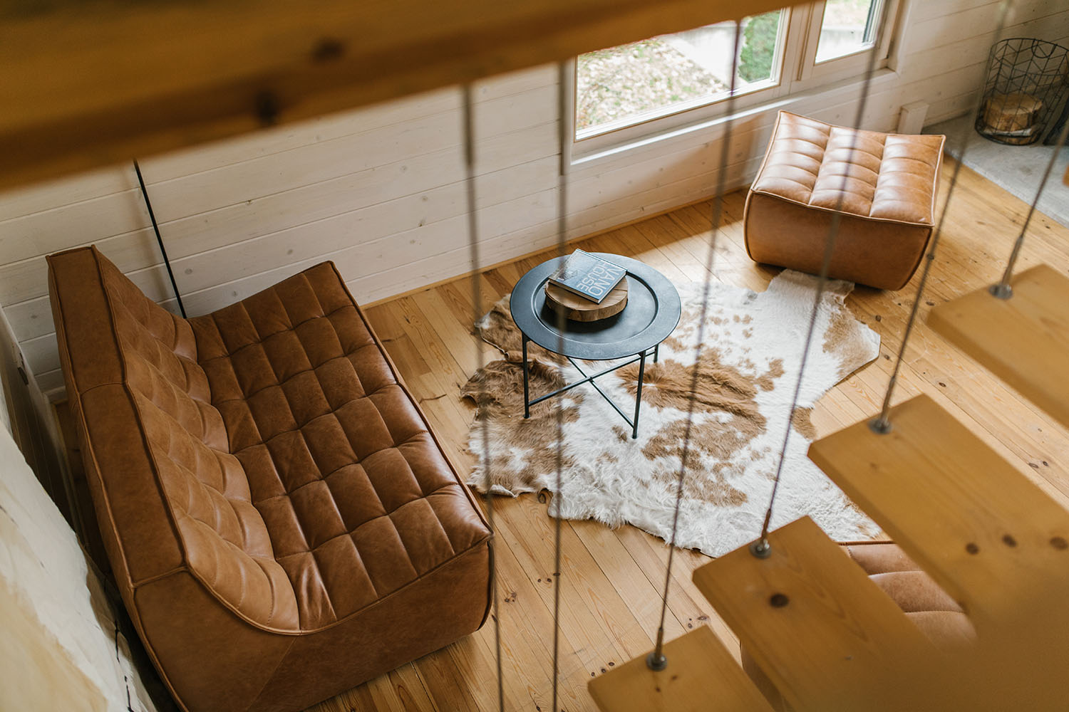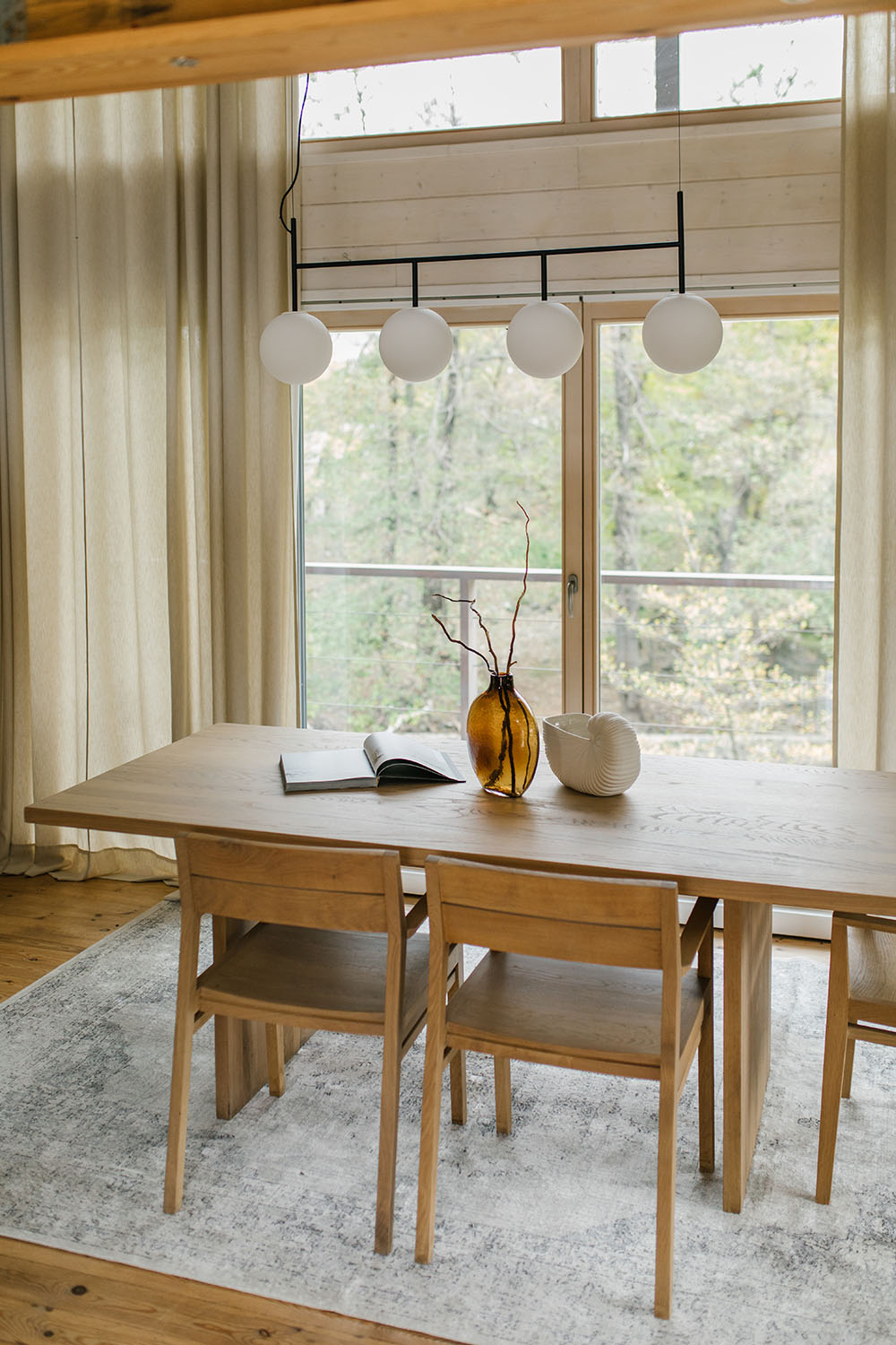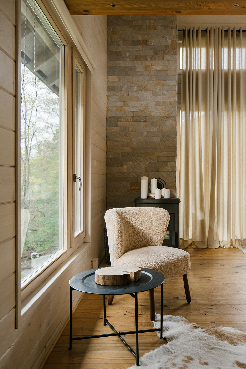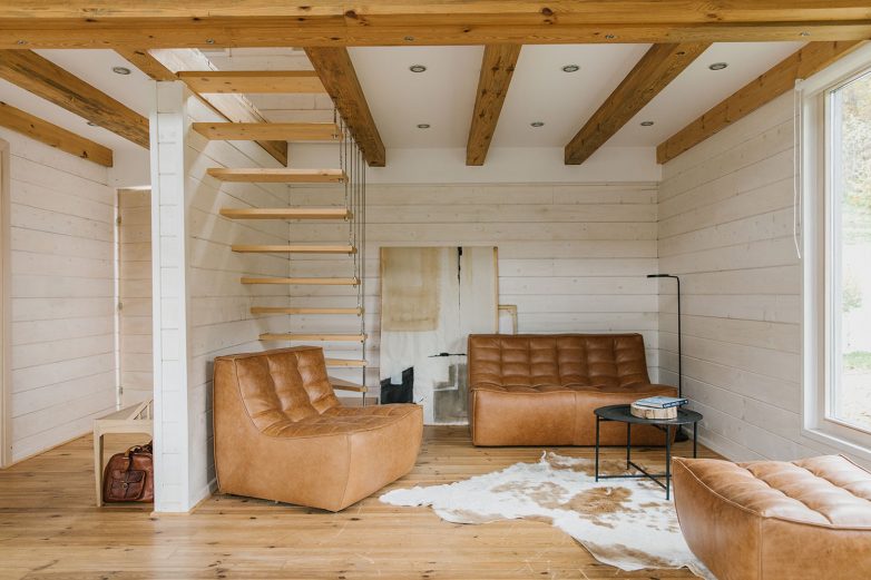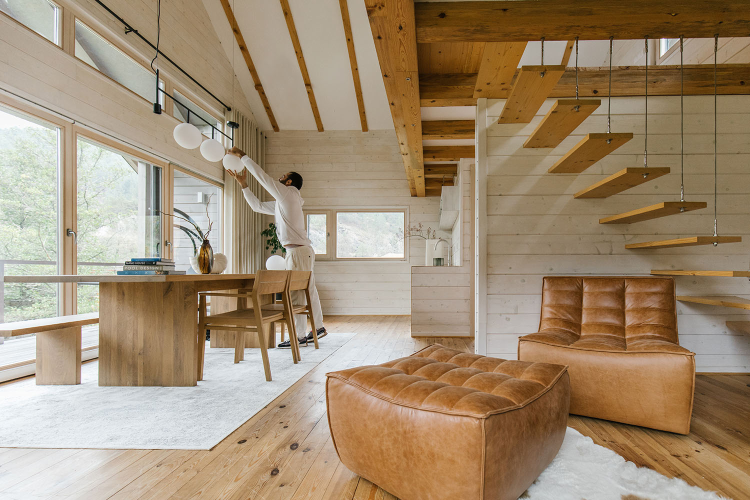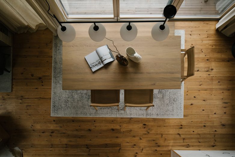 Za konstrukciju i podne obloge je drvo zadržalo svoj prirodni ton i time predstavlja osnovu estetike projekta, dok se za zidnu oblogu drvo toniralo u svetlije nijanse. Tretmanom površina pažnja korisnika se usmerava na okruženje koje se oslikava u prozorskim otvorima značajnih dimenzija. „Da bi se zadržao osnovni koncept upotrebe prirodnih materijala, u dnevnoj zoni su odabrani komadi nameštaja brenda Ethnicraft u koži kamel boje“ – dodaje Rašković.