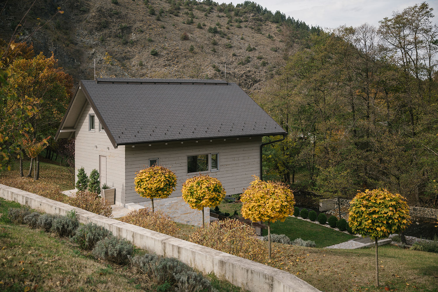 Glavni materijal za fasadu i stolariju je drvo bajcovano u svetlo-sive tonove. „Koristili smo nekoliko vrsta drveta različite završne obrade, kako bi se drugačijim teksturama doprinelo na dinamici u prostoru“. Podrumski prostor je obložen rustičnim listelama, kako bi se napravila direktna veza sa starim kamenim mostom koji se proteže po obodu parcele.