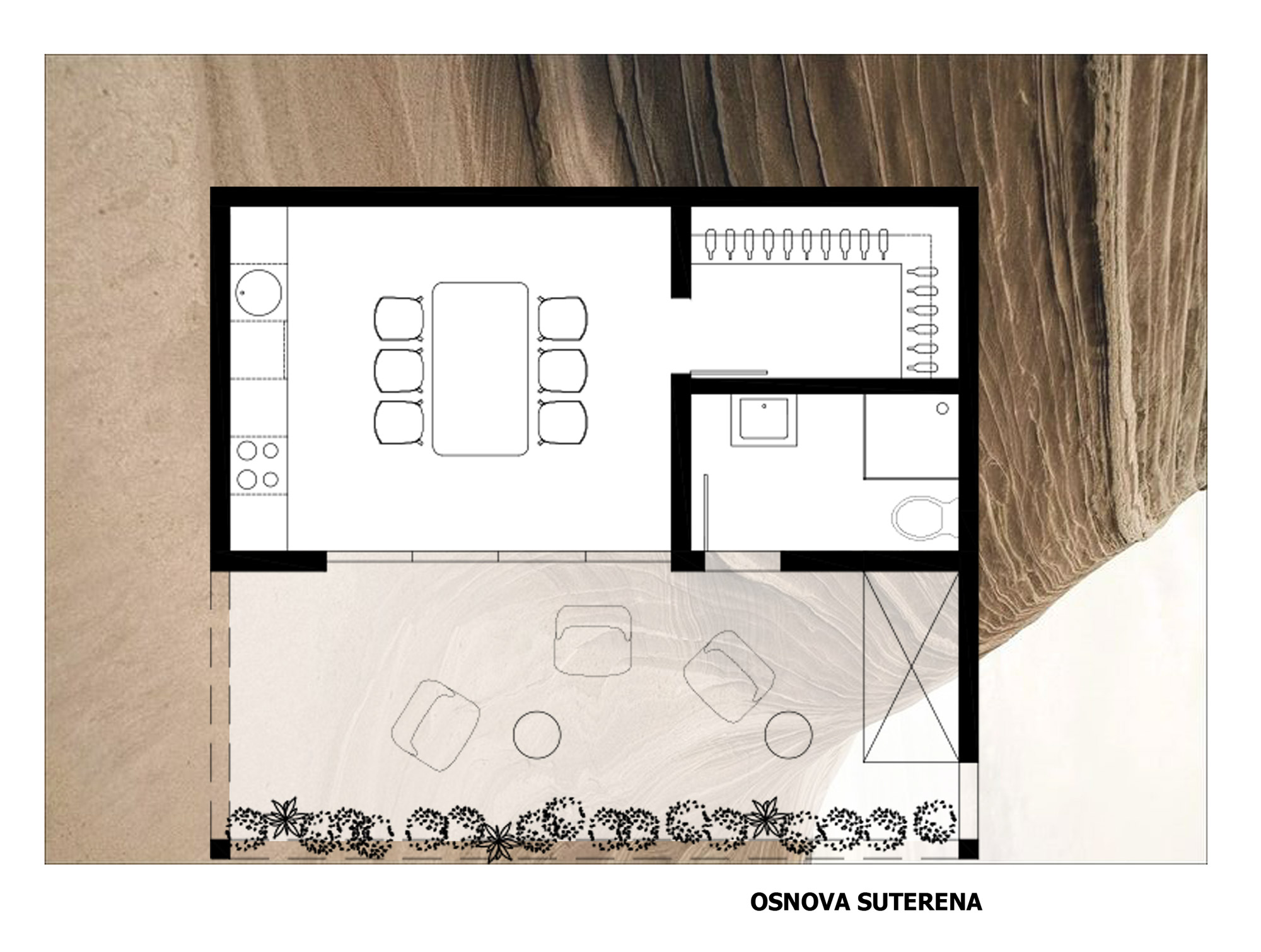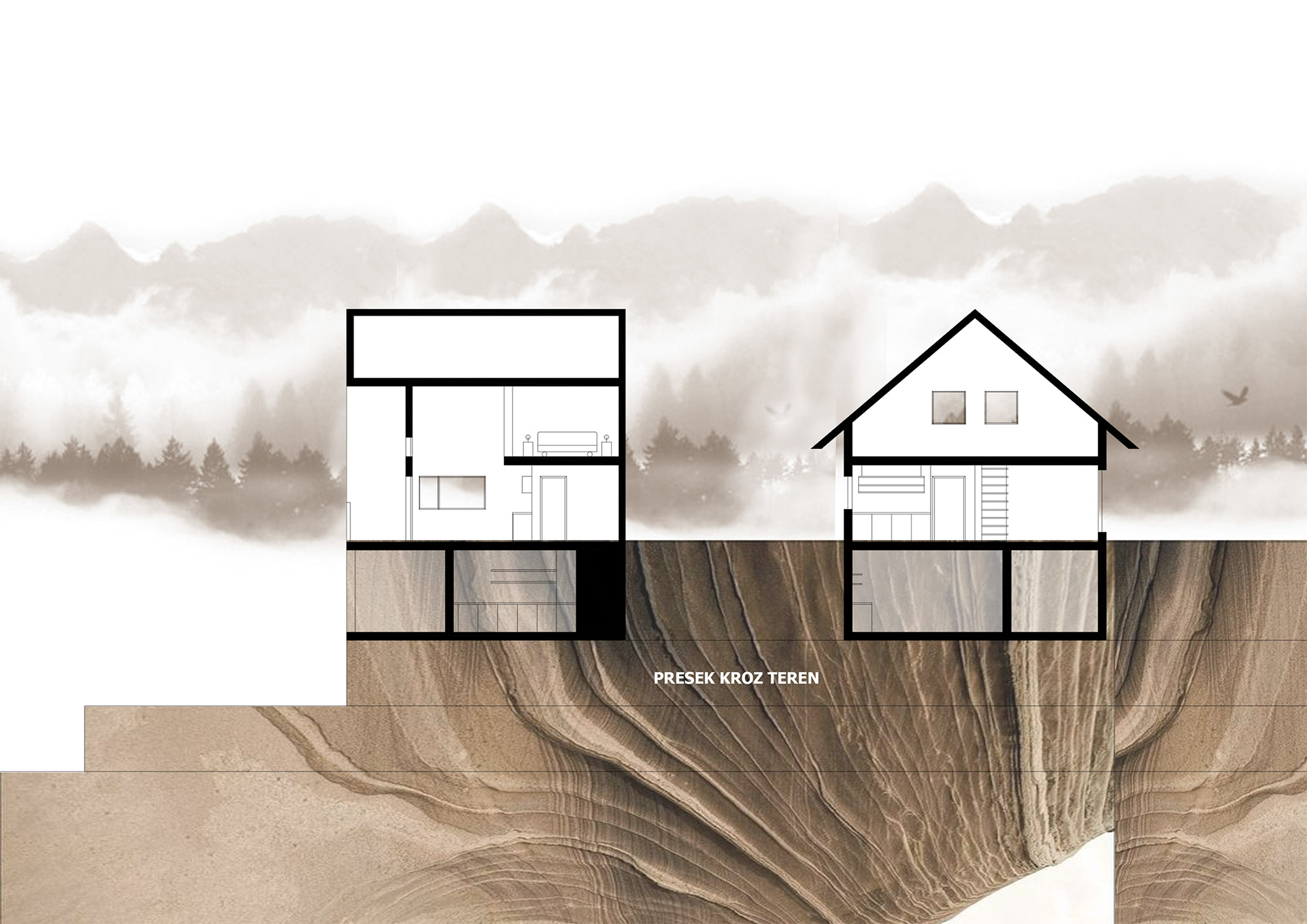 Prvi je suterenski deo koji se koristi u toplijim mesecima, te je zbog pada terena jednim delom ukopan u zemlju. Drugi deo je boravišni, gde su arhitekta i klijent realizovali zamisao da se velikim prozorskim otvorima na prednjoj fasadi unutrašnjost poveže s prirodom i predelom.