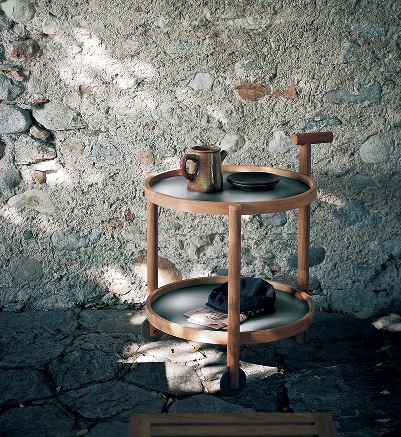 Ovaj proizvođač preporučuje da nameštaj za eksterijere bude izveden od vrlo kvalitetnog drveta koje podnosi vlagu i spoljne uticaje. Zato je u svoju kolekciju uvrstio drveni sto na rasklapanje sa pločom sastavljenom od manjih komada tikovine postavljene u ritmičkom rasporedu.