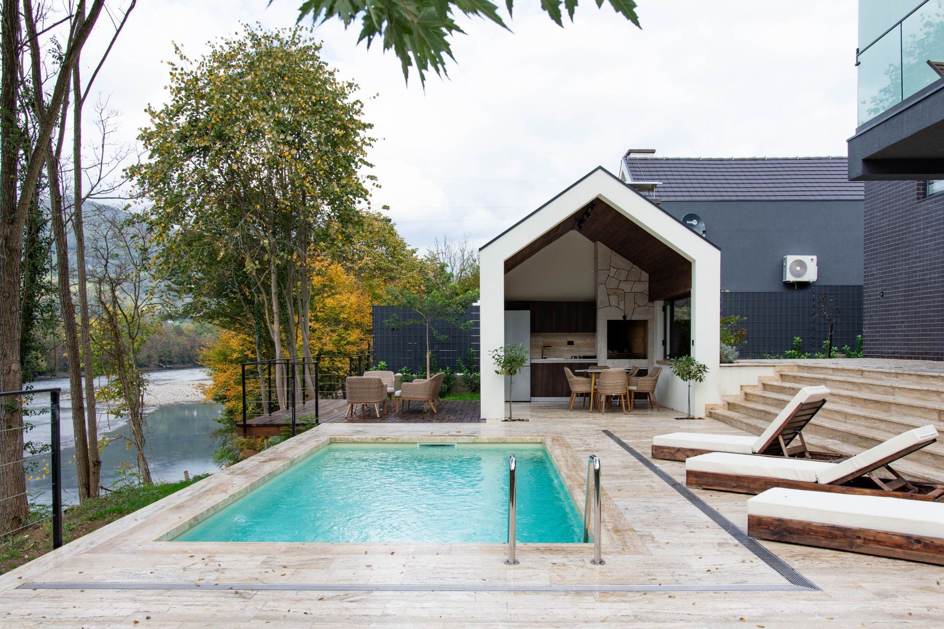 „Mikroambijenti su pažljivo komponovani: zona za sunčanje, otvorena letnja kuhinja i prostor za boravak na otvorenom čine dvorište mestom relaksacije i boravka u prirodi tokom celog dana. Lagane metalne ograde sa sajlama dodatno osiguravaju da ništa ne narušava pogled ka reci i šumi“, kažu autori i dodaju: