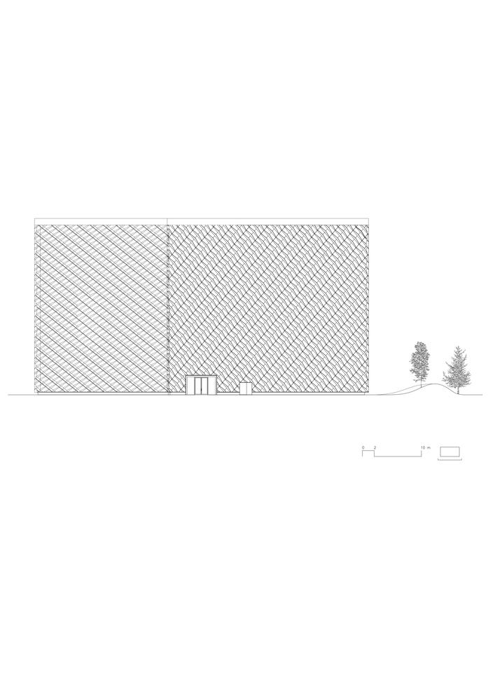 Dijagonalni metalni rešetkasti uzorak fasade naglašava geometriju volumena i daje kompleksu dinamičan i složen spoljni izgled, odnosno izgled koji se, u zavisnosti od svetlosti, transformiše tokom dana, pretvarajući jednostavnu formu u bogato vizuelno iskustvo.