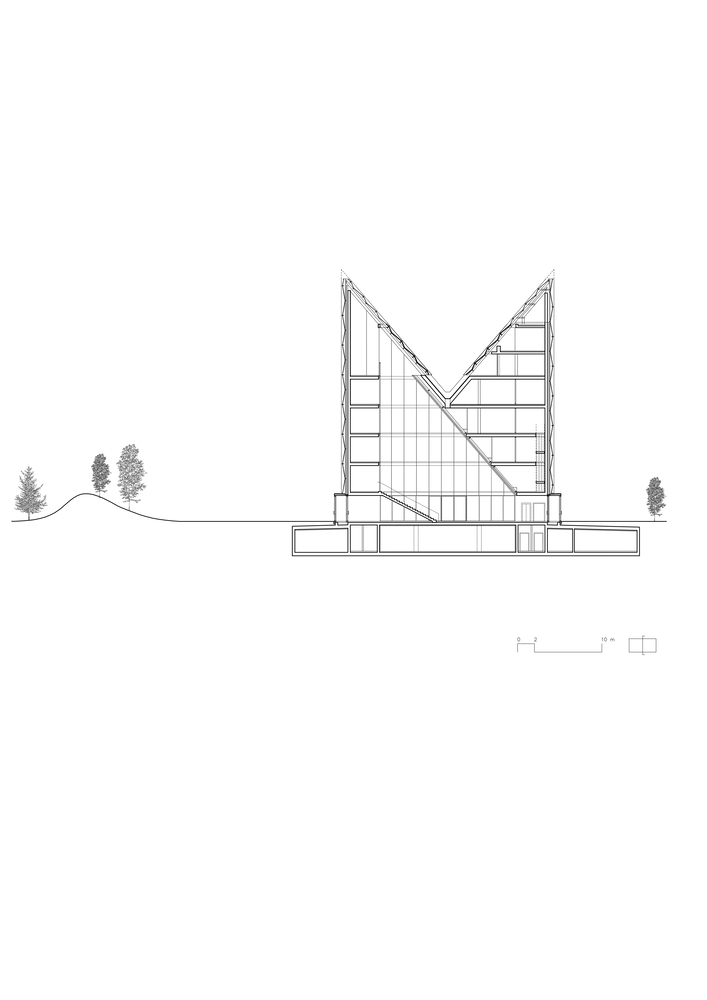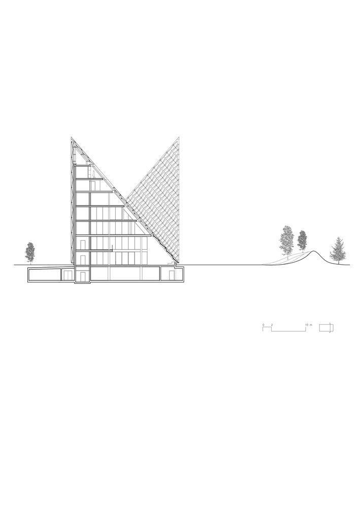 Sa intimnom, ali i monumentalnom vertikalnošću, zgrada maksimalno koristi visinu na svojim vertikalnim površinama, dok se na kosim stranama prilagođava ljudskoj meri. Ovaj kontrast ne samo da ističe zgradu unutar njenog okruženja, već stvara i vizuelni dijalog između arhitekture i prirode.