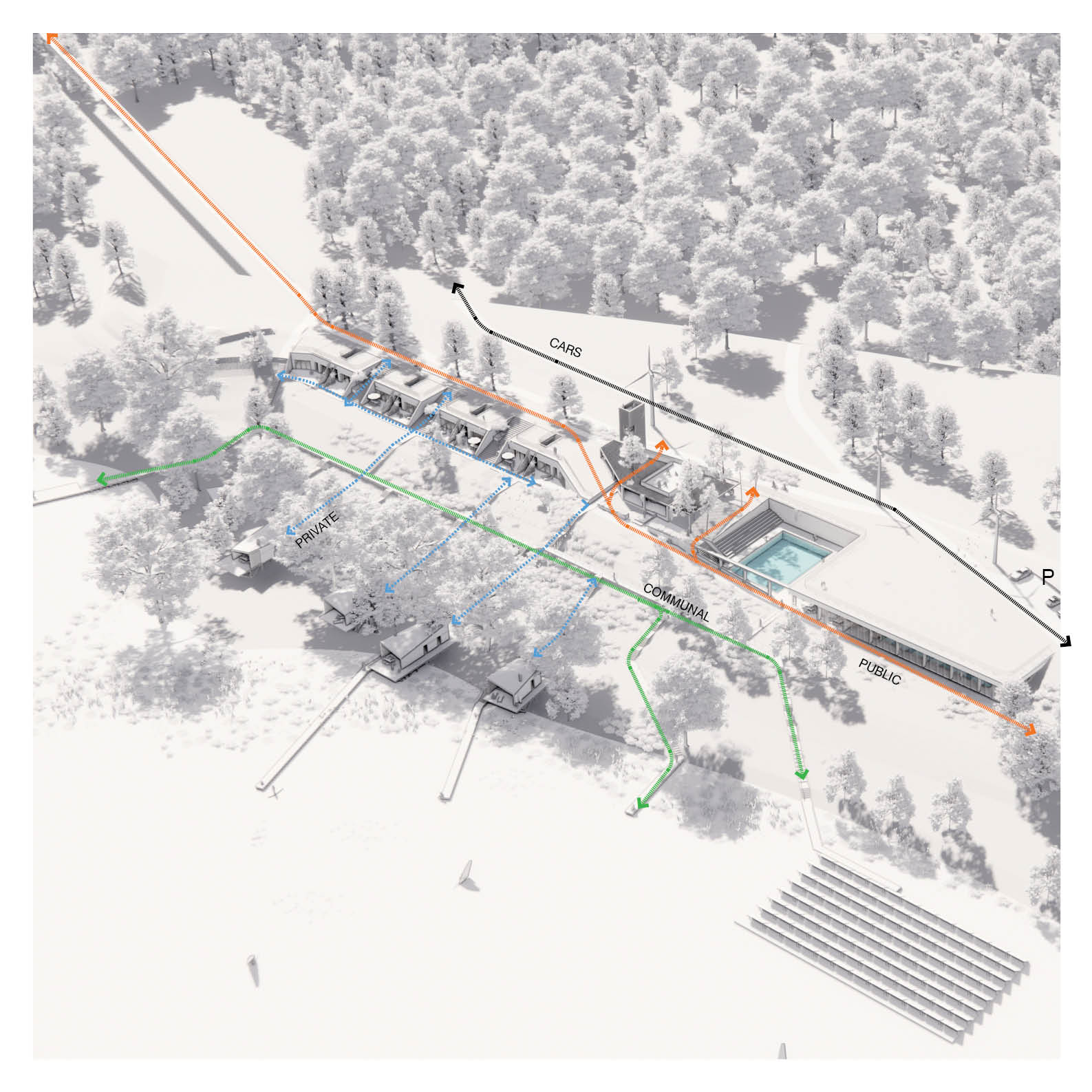Orijentacija javnih sadržaja, bazena i restorana, takođe je severna i prati topografiju lokacije u koju je ugrađena, a sve površine ka jugu pokrivene su zelenim krovovima koji krupne sadržaje integrišu u prirodni teren, a što ujedno poboljšava energetsku efikasnost objekata.