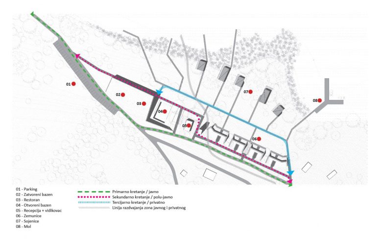 Konceptom je predviđena podela prema karakteru i funkciji dela kompleksa, na javniju i privatniju zonu.