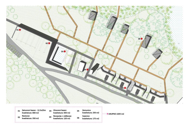 Kompleks će sadržati smeštajne jedinice projektovane kao tipske zemunice i sojenice, otvoreni i zatvoreni bazen, kao i restoran sa 50 mesta za sedenje.