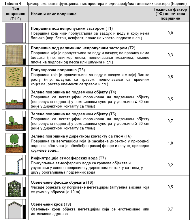 - Zelene površine u direktnom kontaktu sa tlom (težinski faktor 1);