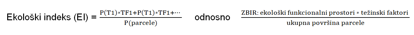 PGR SZP objašnjava na koji način se to praktično postiže: “Ekološki indeks (EI) parcele predstavlja količnik zbira površina (P) pojedinačnih ekološki funkcionalnih prostora parcele (T1, T2,…) pomnoženih sa odgovarajućim težinskim faktorom (TF1, TF2,…) i ukupne površine parcele.”