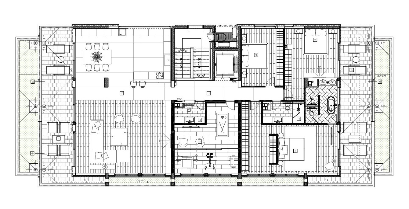 Penthouse je nešto zaista retko i izuzetno. Stan od 267 kvadrata zauzima čitavu osnovu sprata. Ima dve prostrane terase na oba kraja prvog sprata i još jednu prostranu terasu na drugom spratu, sa bogatim i raznovrsnim sadržajima. U programskom smislu, naročito je interesantna hobi soba koja zauzima glavno, centralno mesto u penthouse stanu.