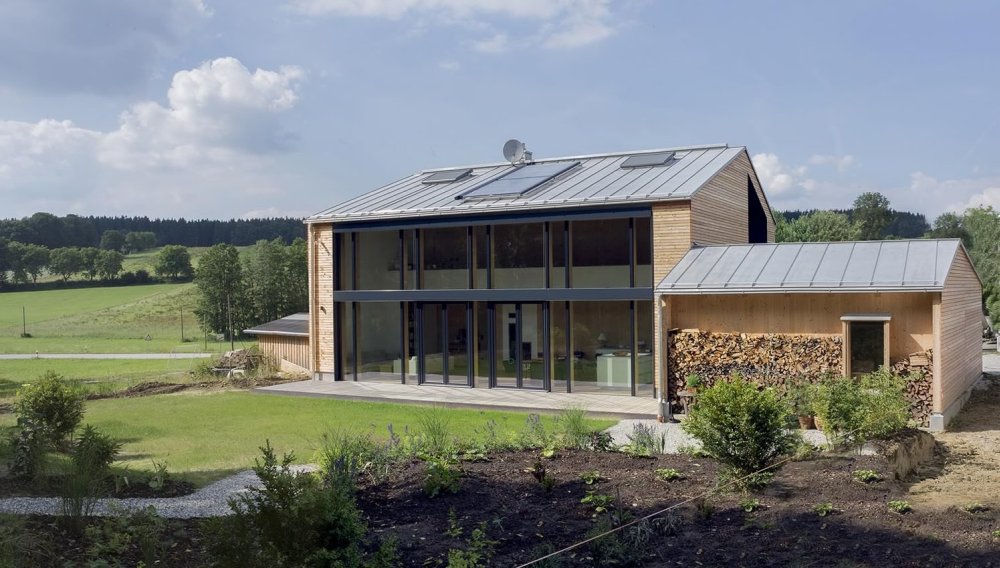 Kuća u Dorfenu od 150 kvadrata, čiji projekat potpisuju Wolfertstetter Architektur, na izgled ne deluje previše toplo pre svega zbog ogromne staklene fasade od oko 60m². Ipak, stvari stoje sasvim drugčije. Pre svega, staklena površina okrenuta je na jugozapad, odakle i dolazi najveći priliv sunčeve energije, a kao drugo, radi se o trostrukim prozorima izrađenim u kombinaciji drvo-alumijum.
