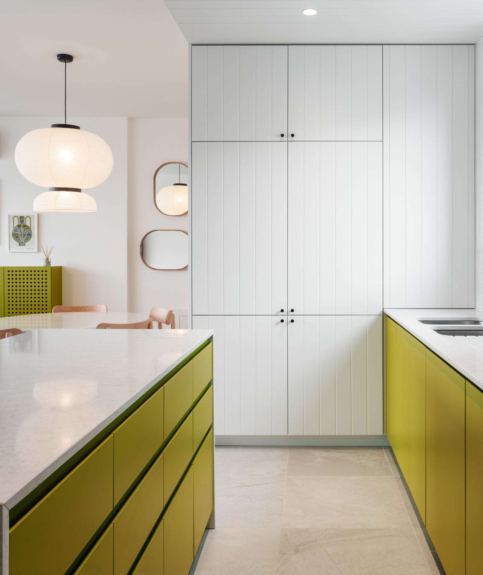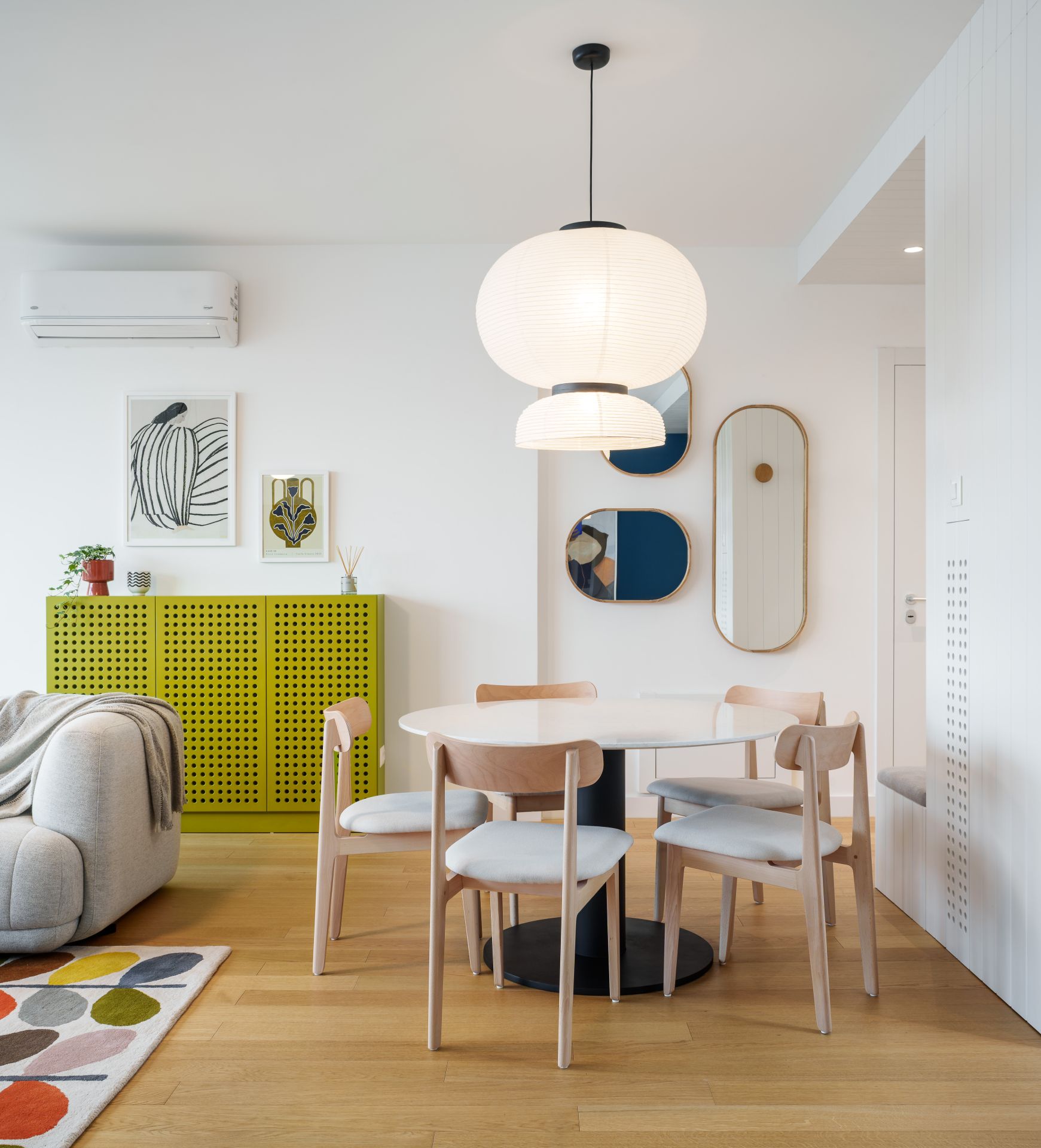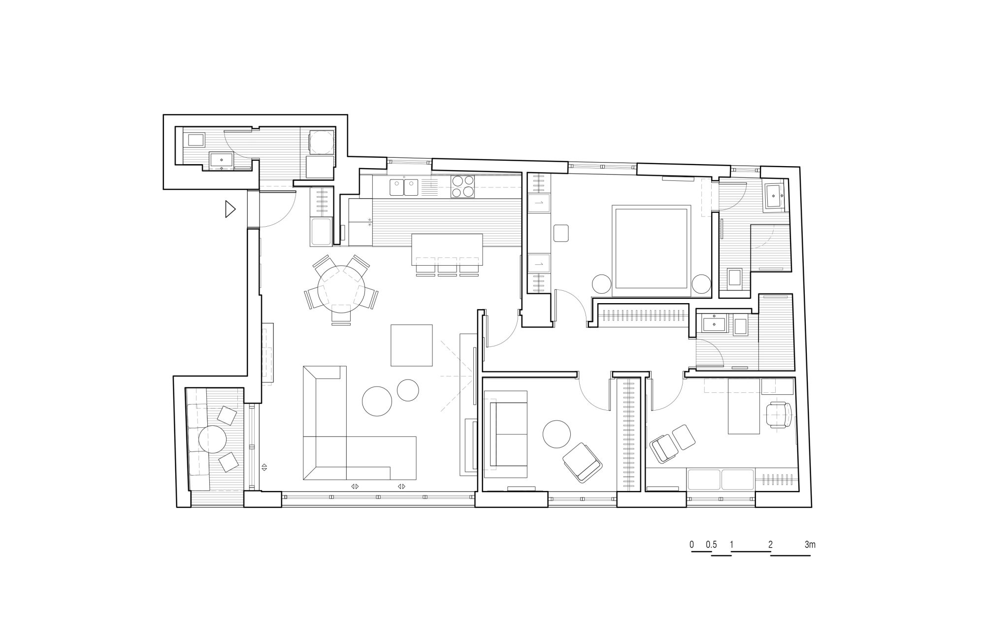 Što se tiče rasporeda prostora, klijenti su zahtevali da se zadrži postojeća struktura stana, koja je i arhitektama bila jednako kvalitetna, te stoga nije bilo radova na nivou dodatnog pregrađivanja ili rušenja prostora.