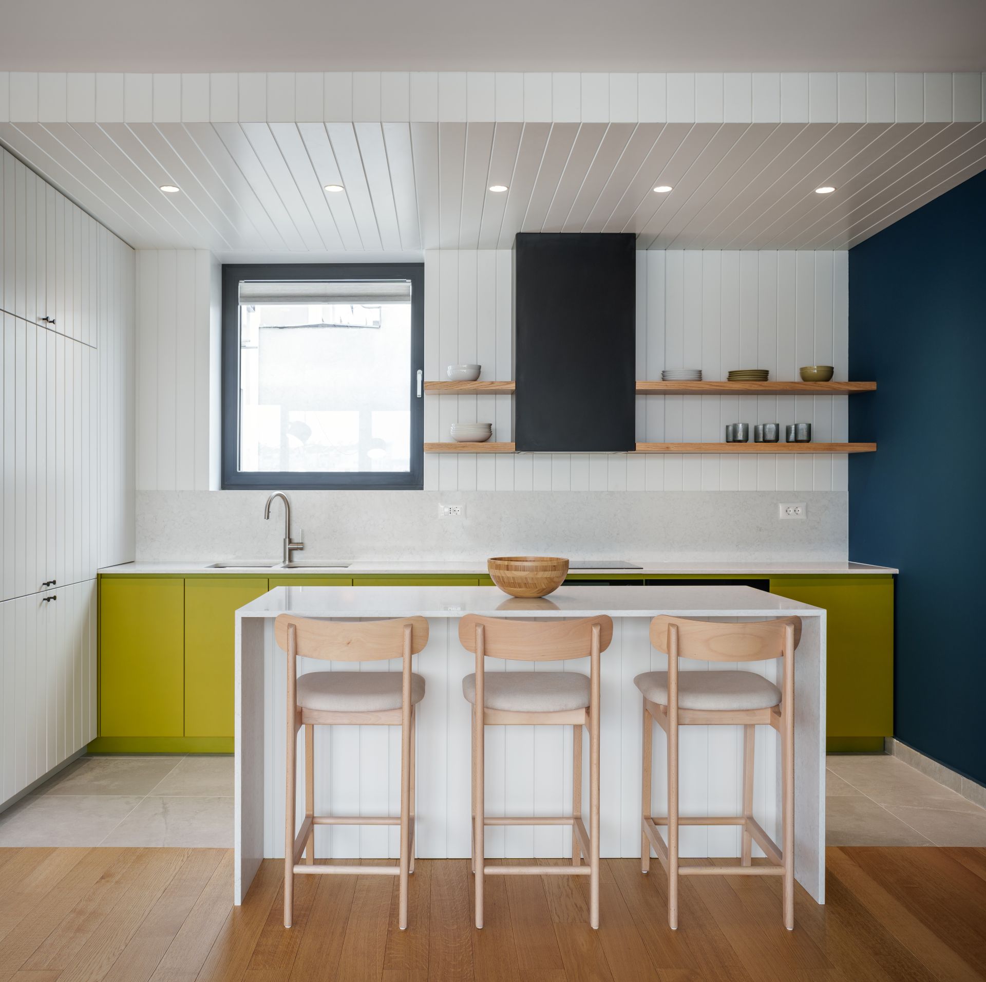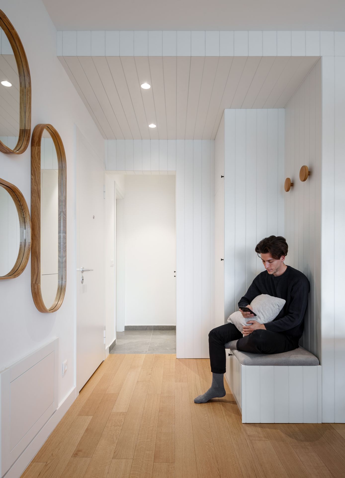 Toplina doma postignuta je primenom drveta kao zidne obloge i upotrebom različitih boja, tekstura i reljefa kroz dizajn ugradnog i odabir komadnog nameštaja.