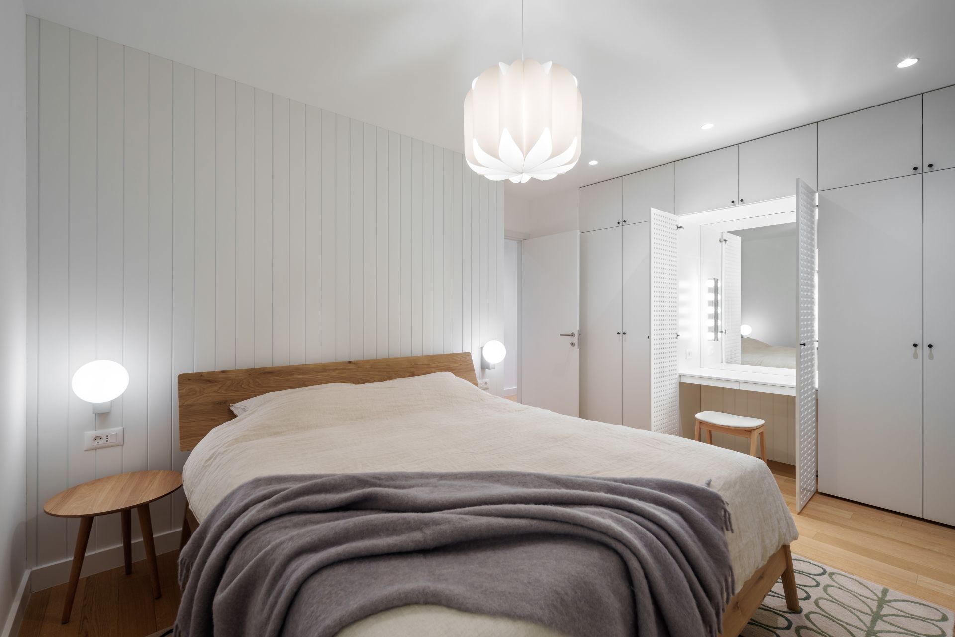 U noćnoj i radnoj zoni su odabrane plafonske visilice svedenog dizajna i svetlih boja, dok je osnovno osvetljenje u stanu plafonsko i ugradno.