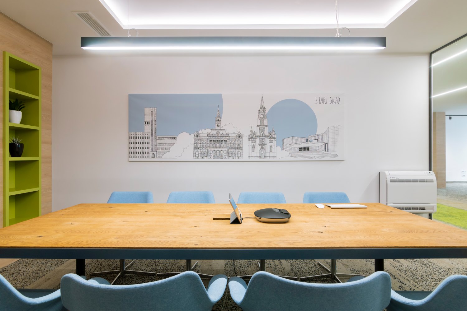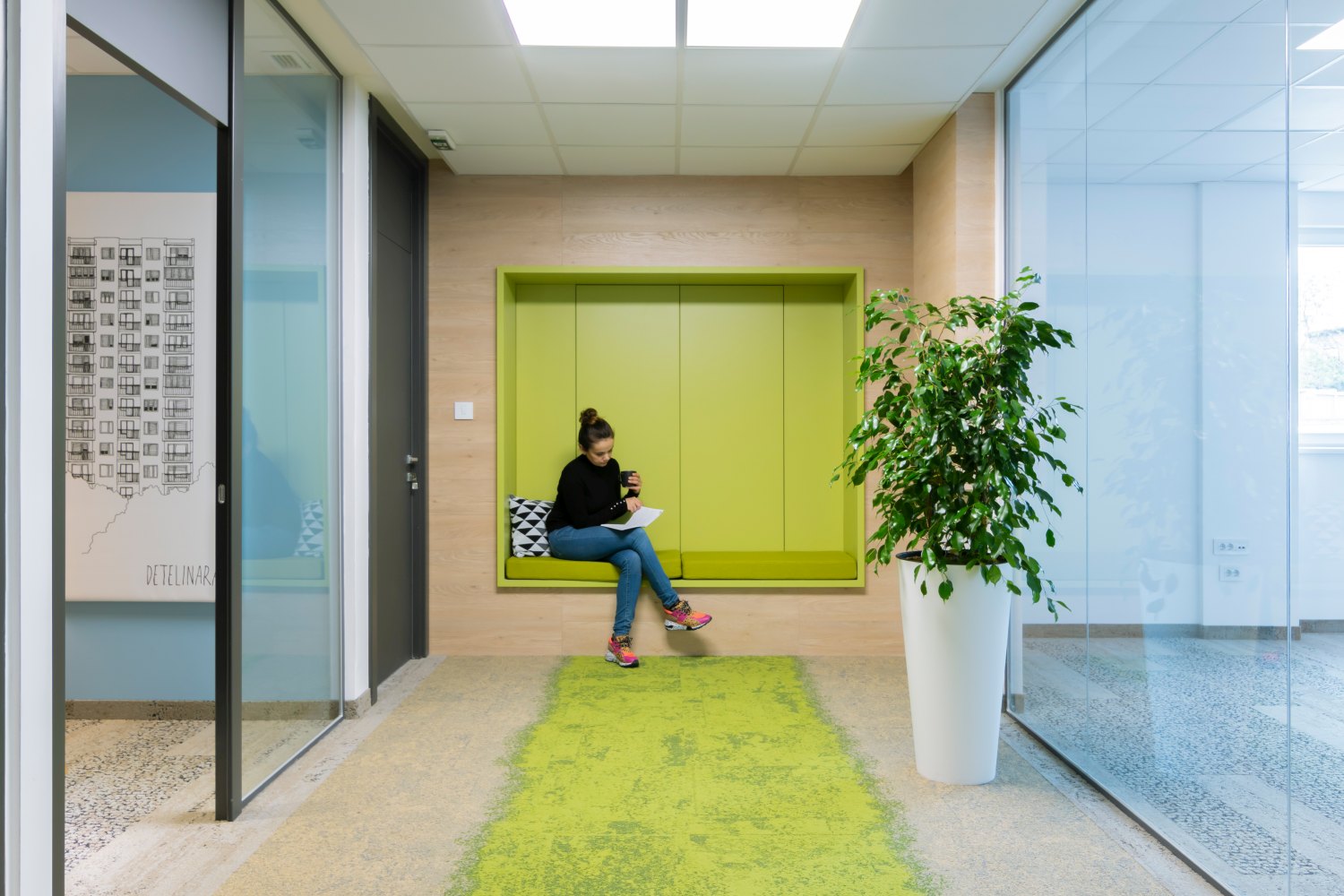 Pored niša u hodniku i phone-boot kancelarija, tu su i tri konferencijske sale koje imaju jedan poseban enterijerski detalj – grafike Novog Sada. Arhitektica Jovana Radujko, poznata po instagram profilu Brutalizam i renesansa, specijalno je za ovaj prostor uradila sedam grafika koje predstavljaju različite delove Novog Sada. Tako zaposleni mogu obaviti sastanak u Limanu ili Novom Naselju i pozvati iz Podbare ili Grbavice. Međutim, još jedan enterijerski zahvat zaslužan je da se zaposleni u ovom poslovnom prostoru osećaju prijatno i prirodno…